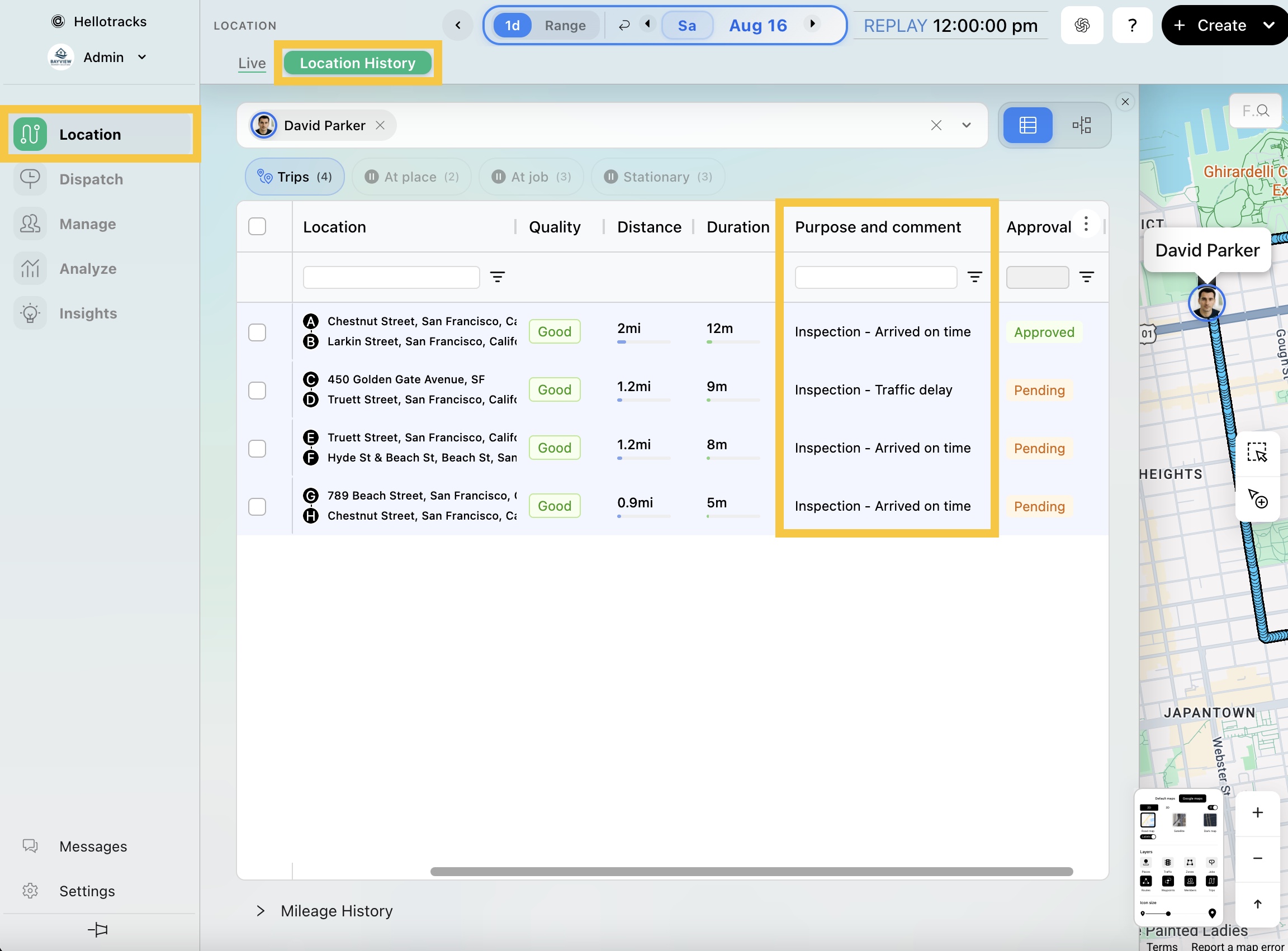 Step 4: Go to Location from the main menu and select Location History to view the trip purpose and comment selected by your Workers for each trip. To learn how to view registered trips, click here.