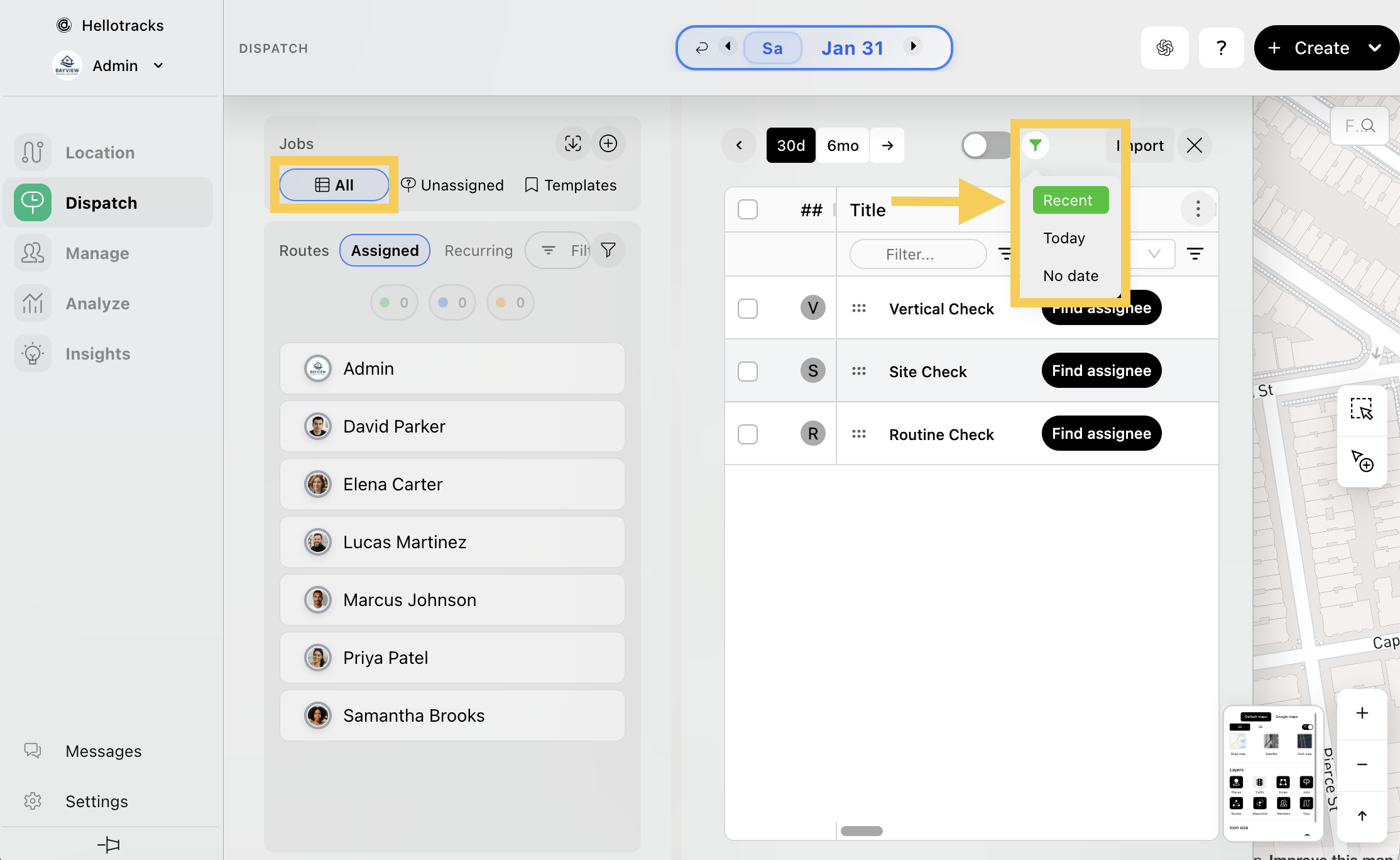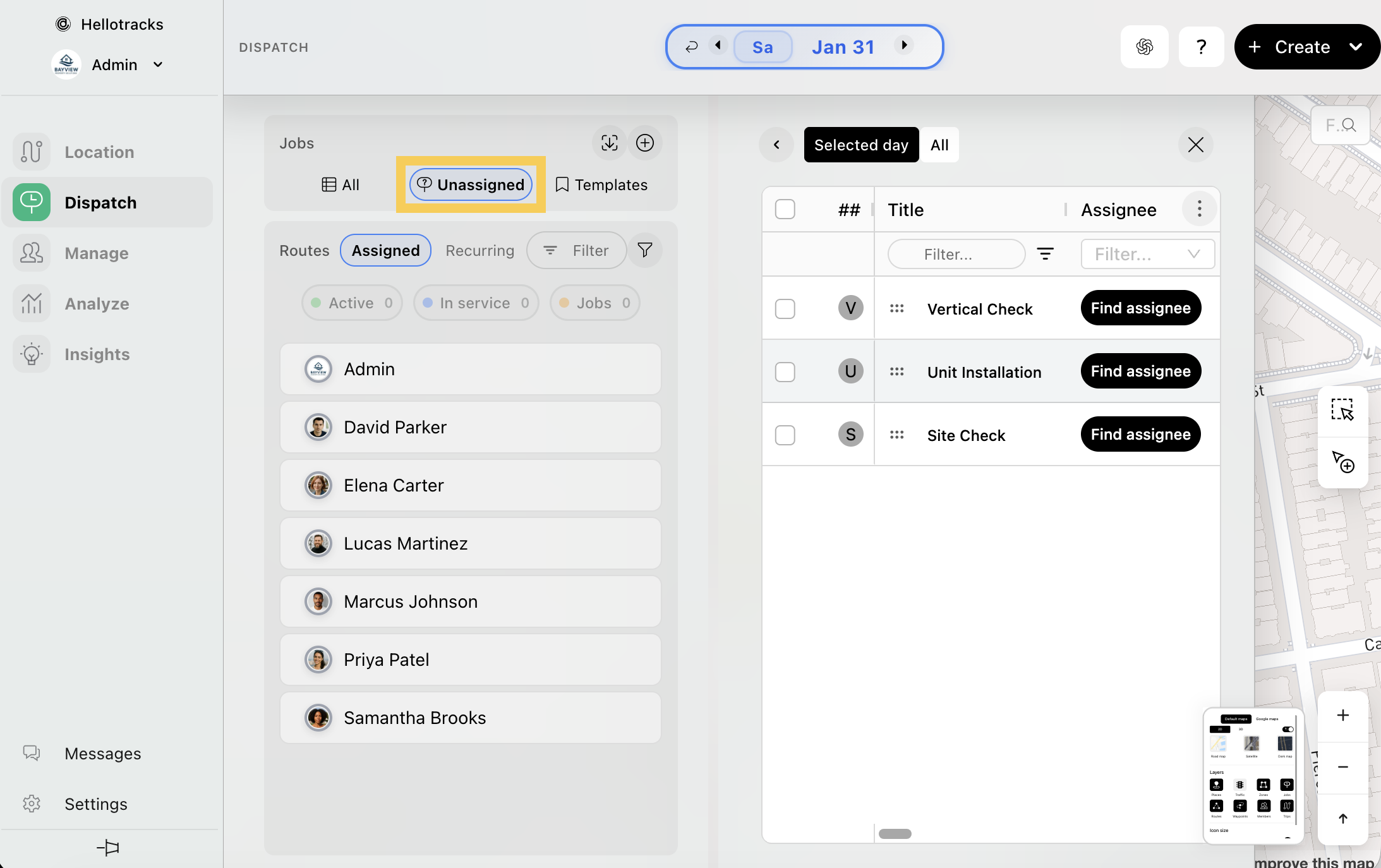 - Navigating to the Unassigned tab under Jobs in the Dispatch menu.
