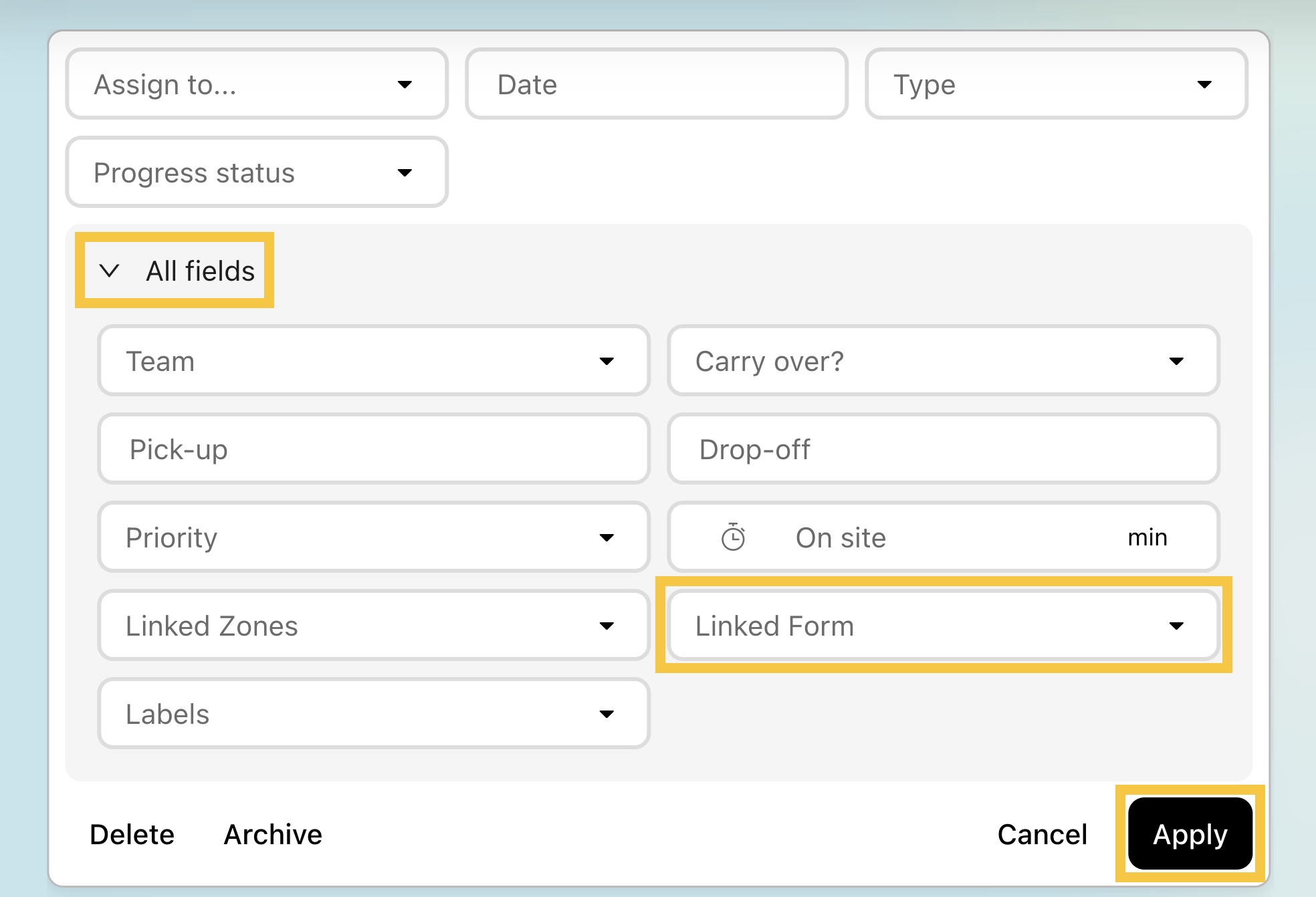 Step 6: Click All fields, open the Linked Forms dropdown and select the Form, then click Apply.