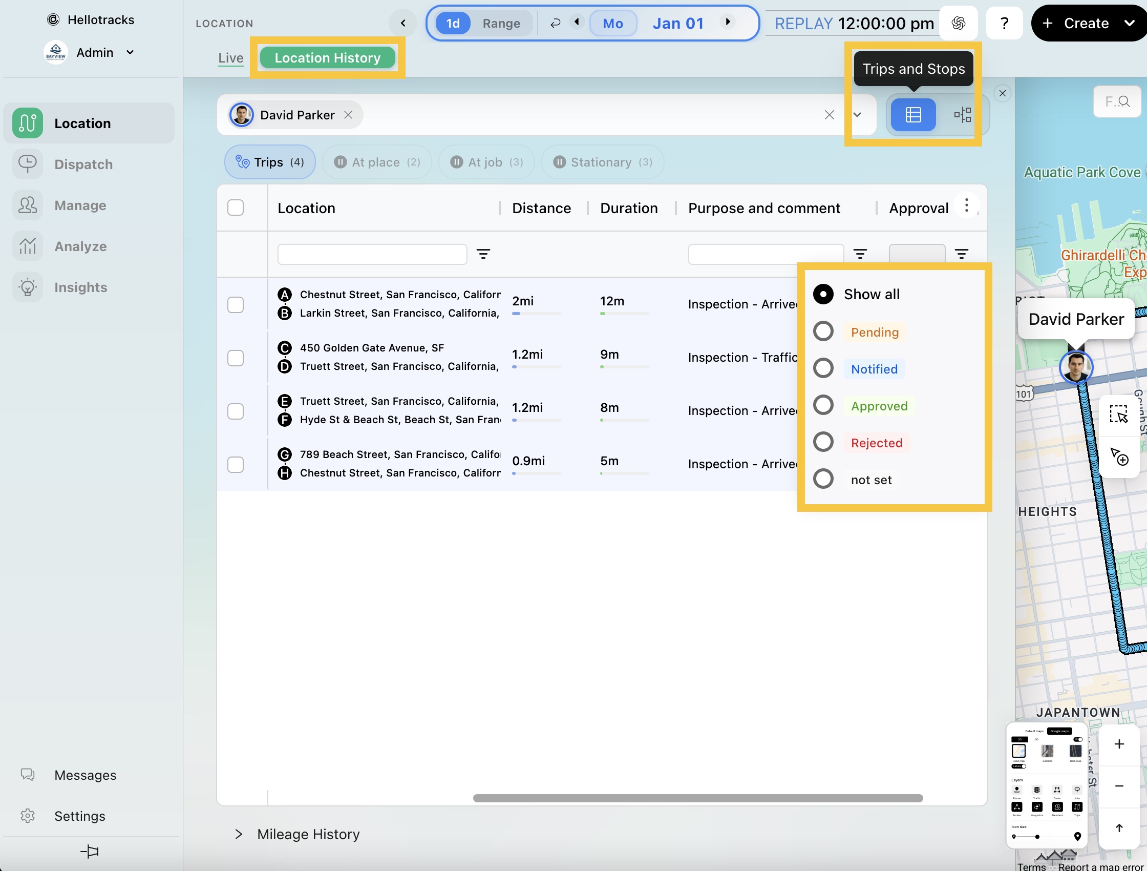 - Within the Location History, go to the Trips and Stops view where you have the ability to filter trips by selecting the specific member and the time frame of interest. This feature simplifies the process of finding the trips you need to review. To further ease the process of locating pending trips for approval, utilize the filtering feature in the Approval column. This enables you to quickly identify trips awaiting your decision.