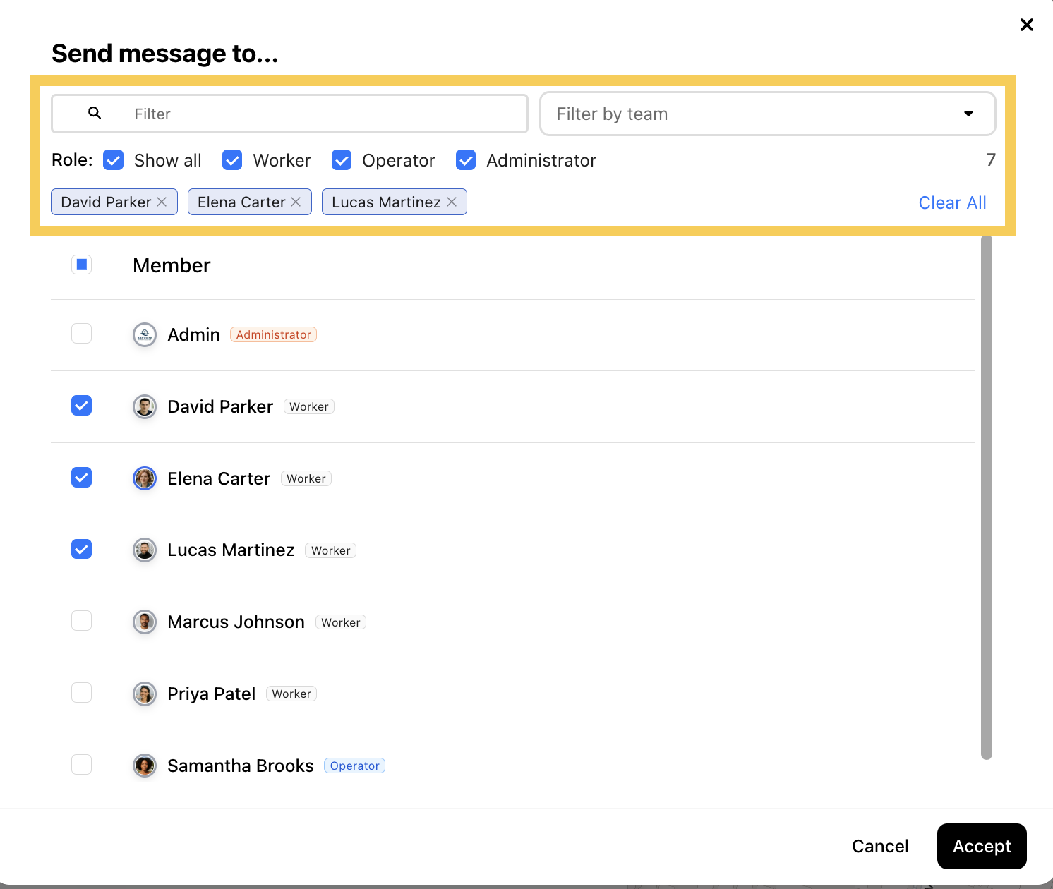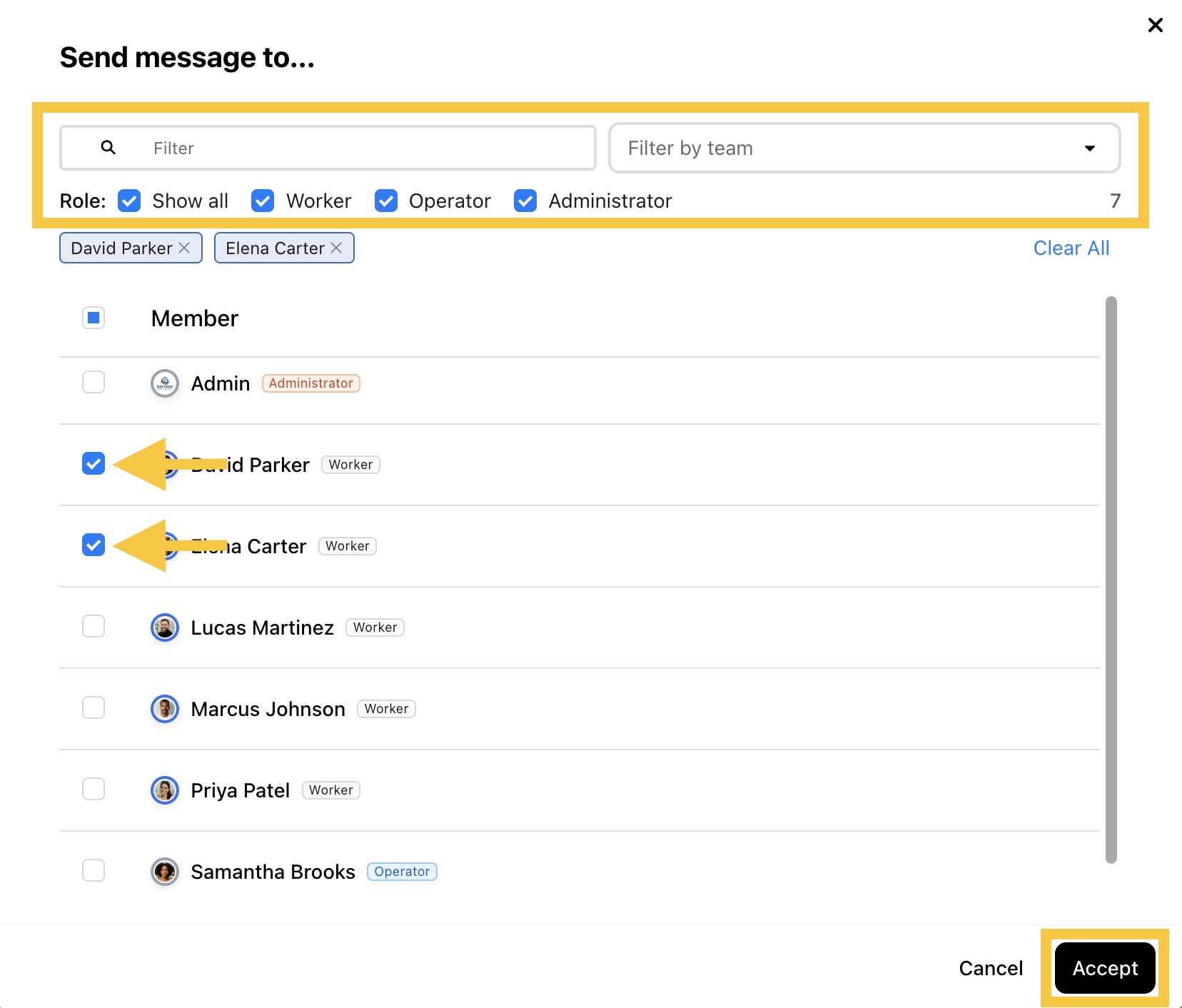 Step 3: Select the member you want to message. Use the filter options to display only specific members. Then, click Accept.