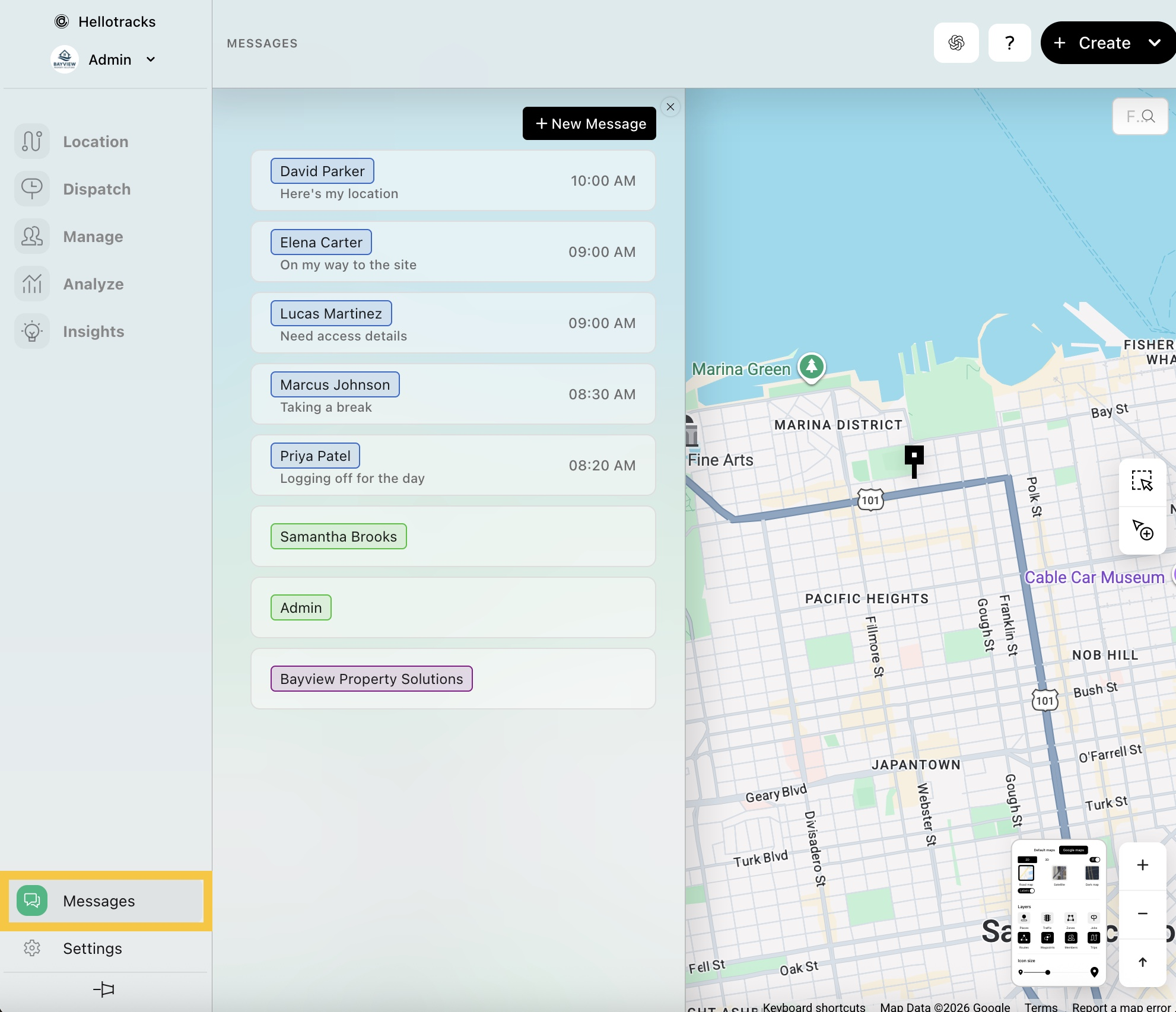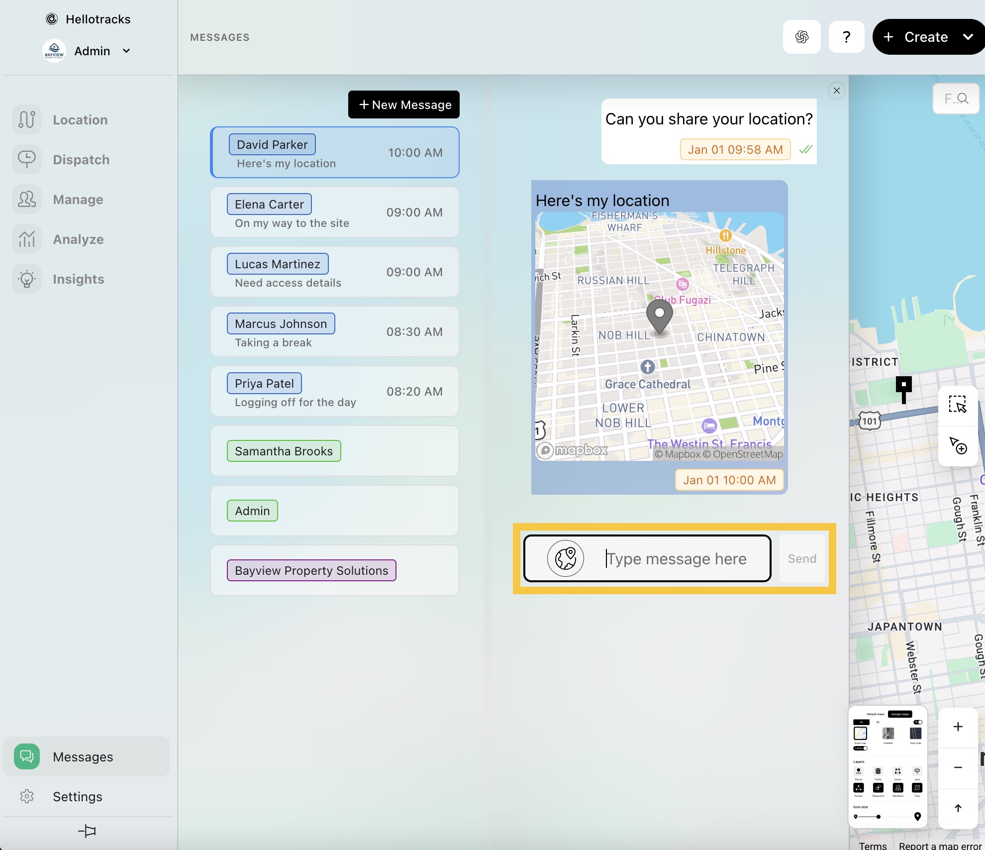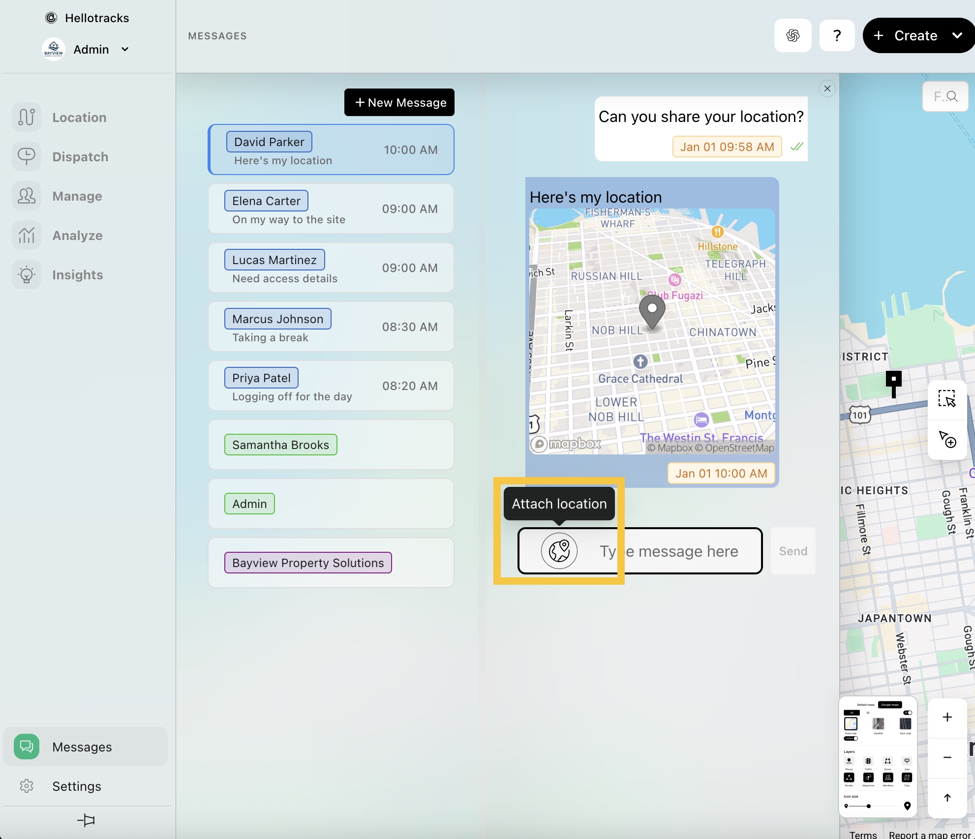 Step 4: To attach a location, click the Attach location icon. A map will appear where you can search for or select the location on the map. Once selected, enter your message and click Send.