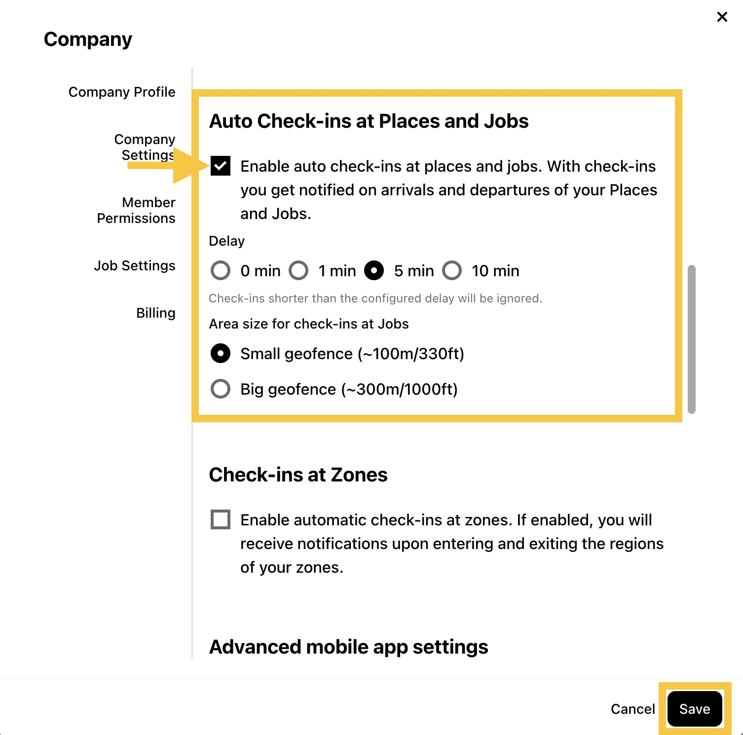 - Area size for check-ins at Jobs: Choose the geofence size to trigger automatic check-ins at Jobs.