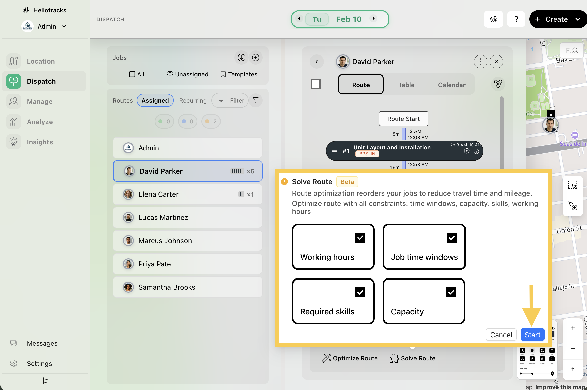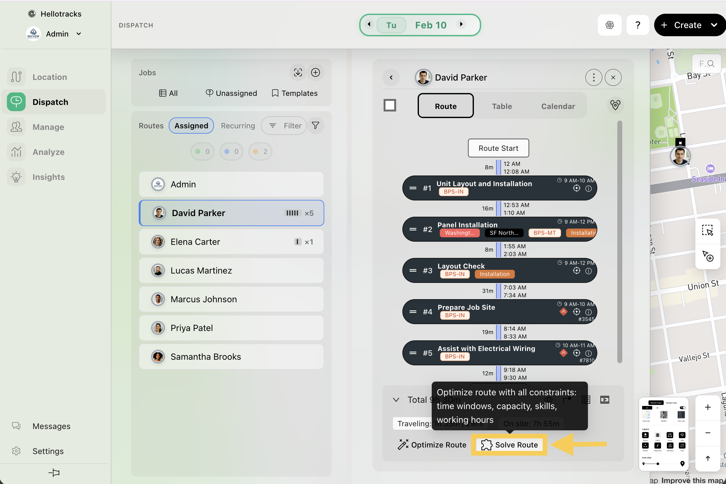 Solve Route optimizes routes by reordering and unassigning Jobs that do not meet specific constraints (i.e., time windows, capacity limits, required skills, and working hours) of each member.