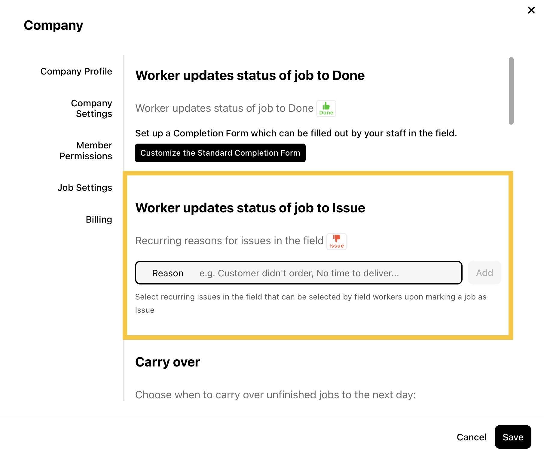 Step 3: In Worker updates status of job to Issue, add the predefined issue reasons that Workers can select when marking a Job as Issue in the mobile app, then click Add.