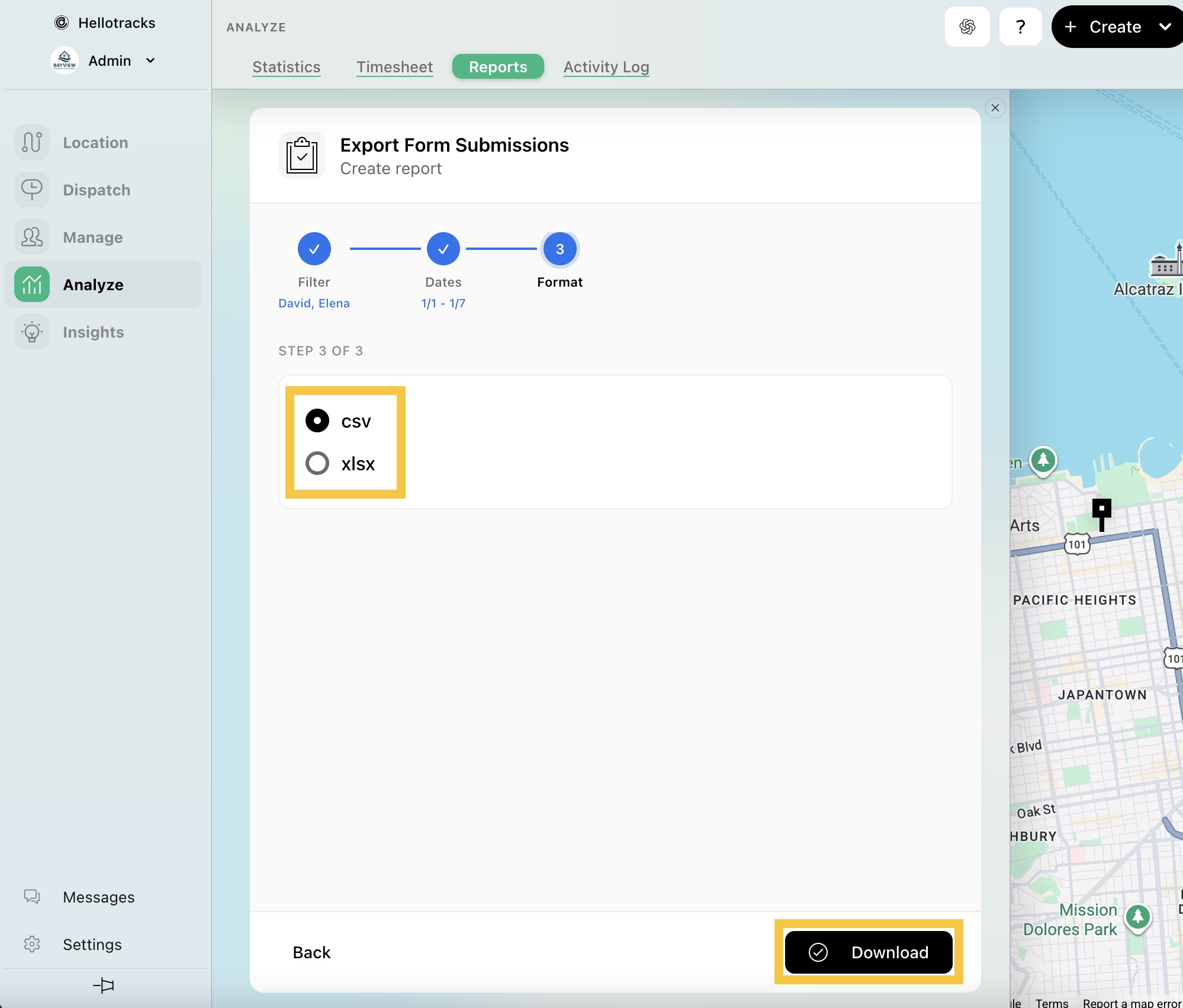 Step 6: Confirm the format (csv or xlsx) and click Download.
