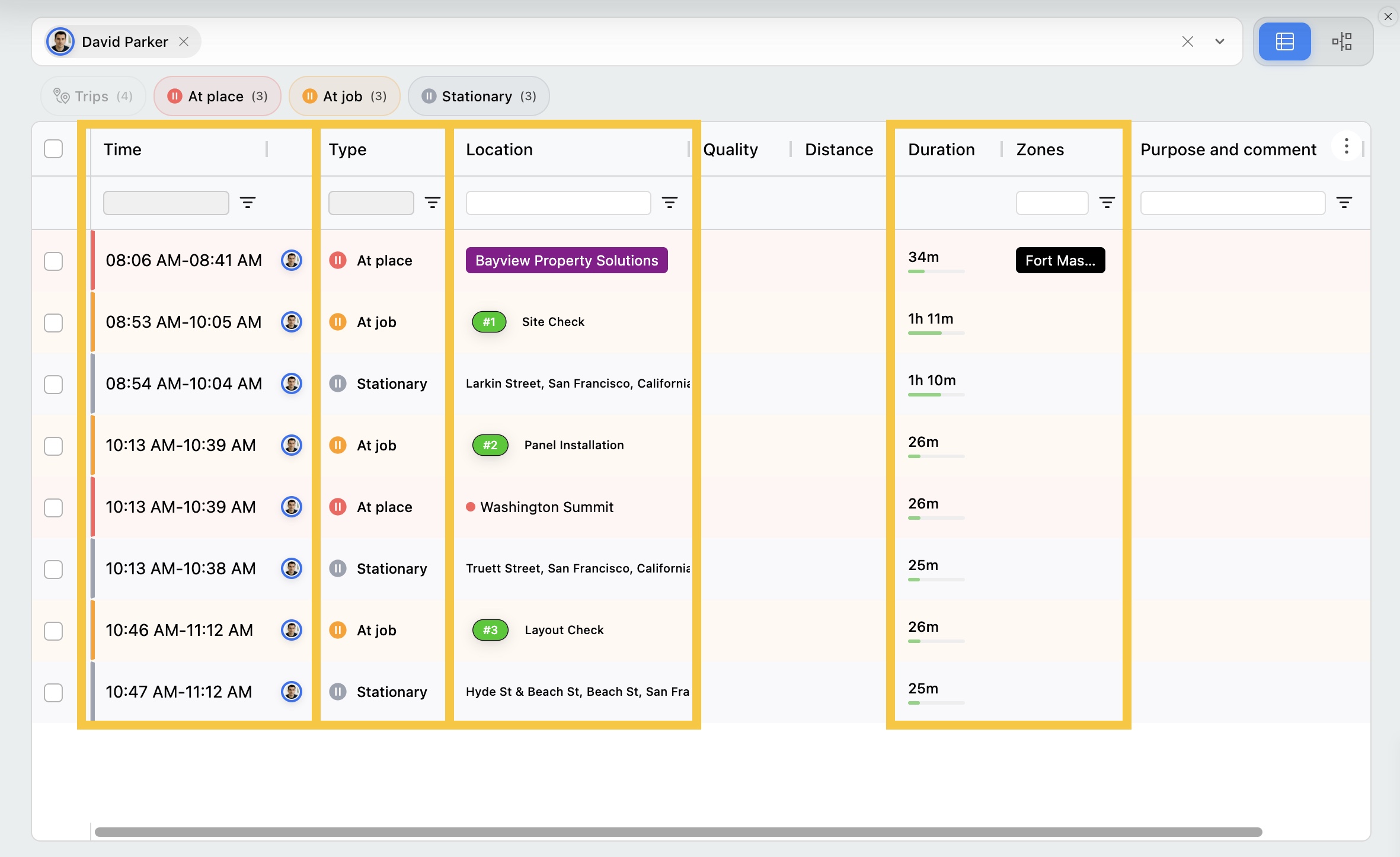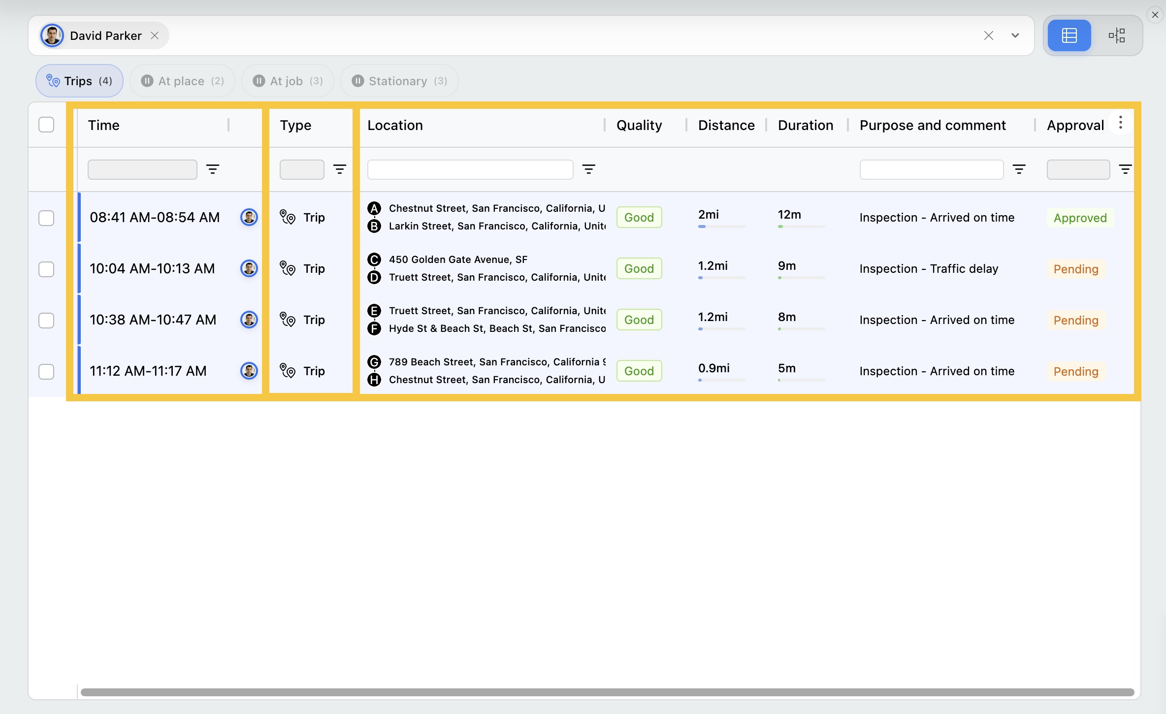 - Approval - Status of the trip’s purpose and comment (e.g., Pending or Approved).