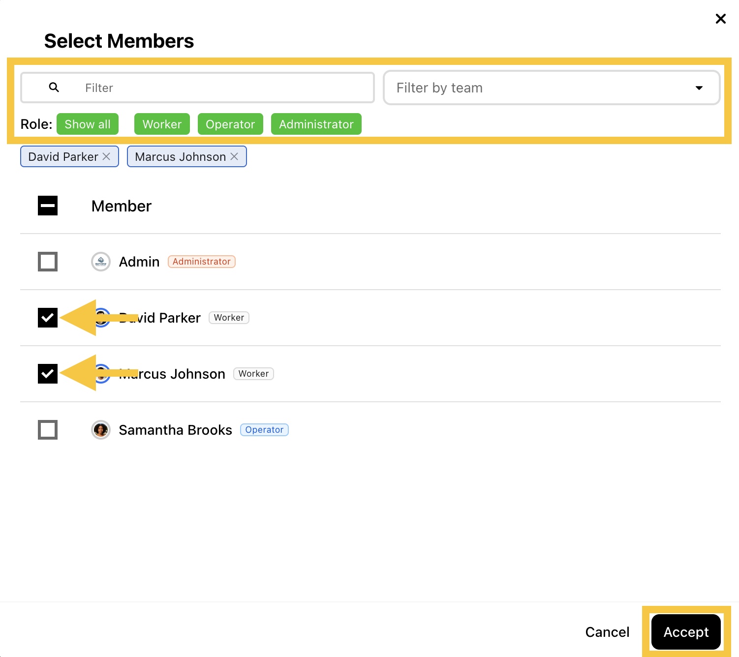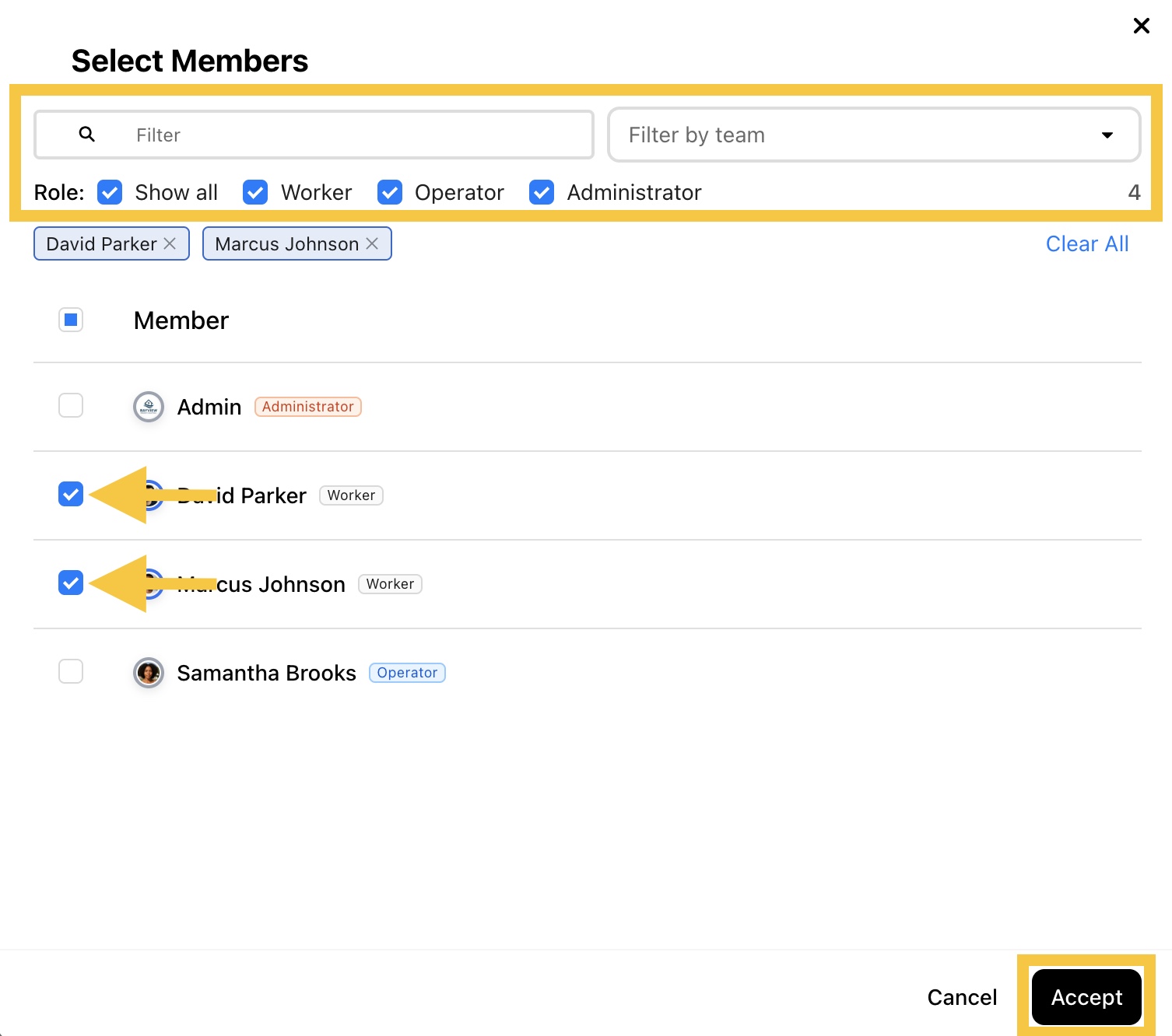 Step 3: Select the members you want to add. Use the filter options to display only specific members. Then, click Accept.