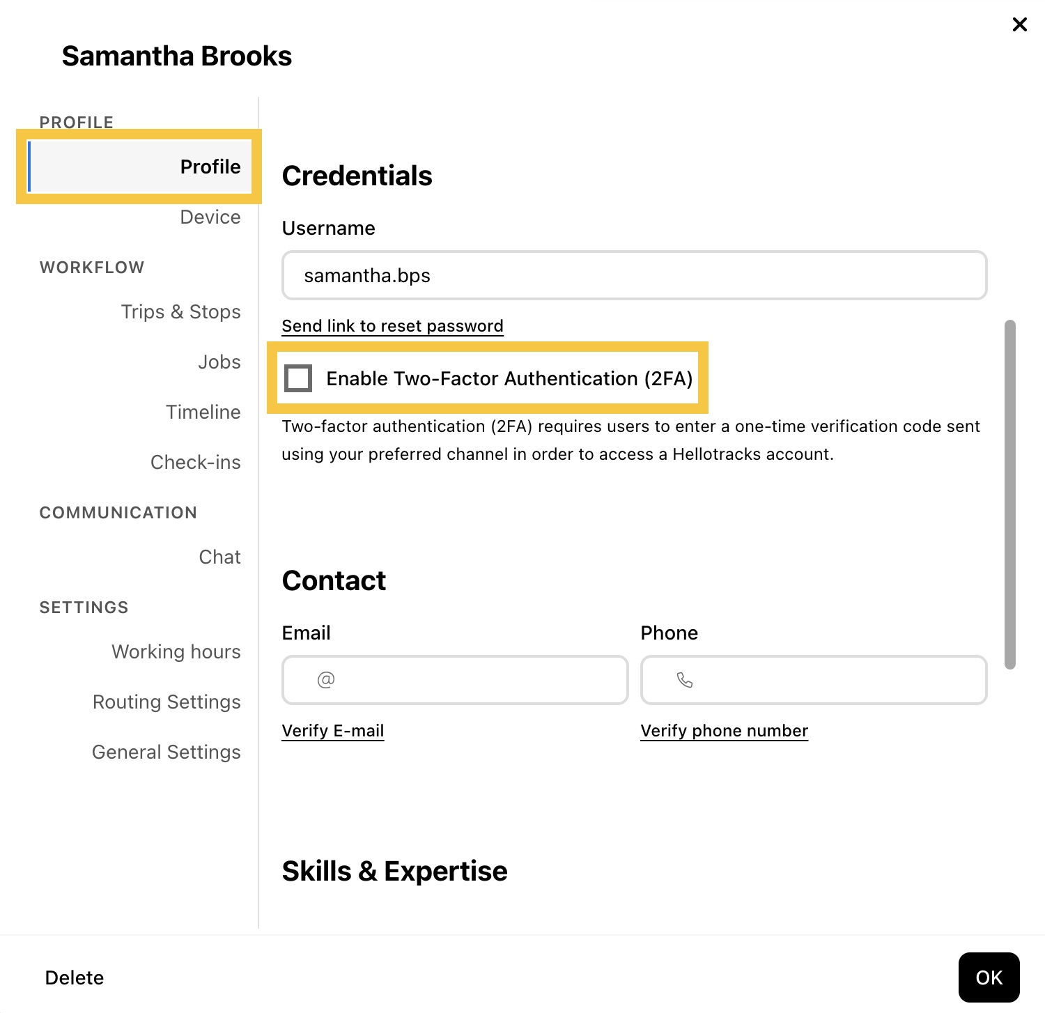 Note: Only a member with the Administrator or Operator role—who has access to the Web dashboard—will see the option to enable 2FA; this option isn’t available for Workers.