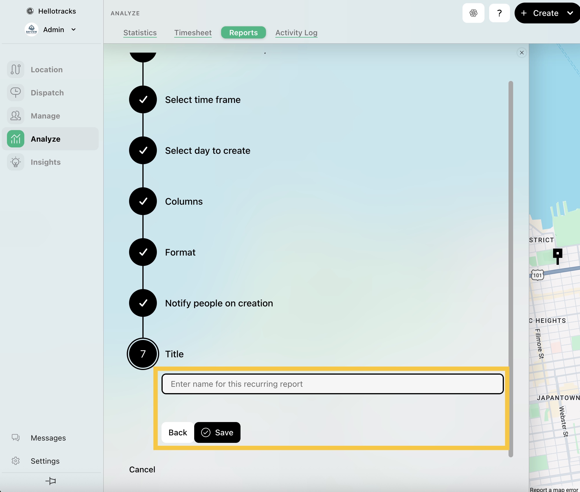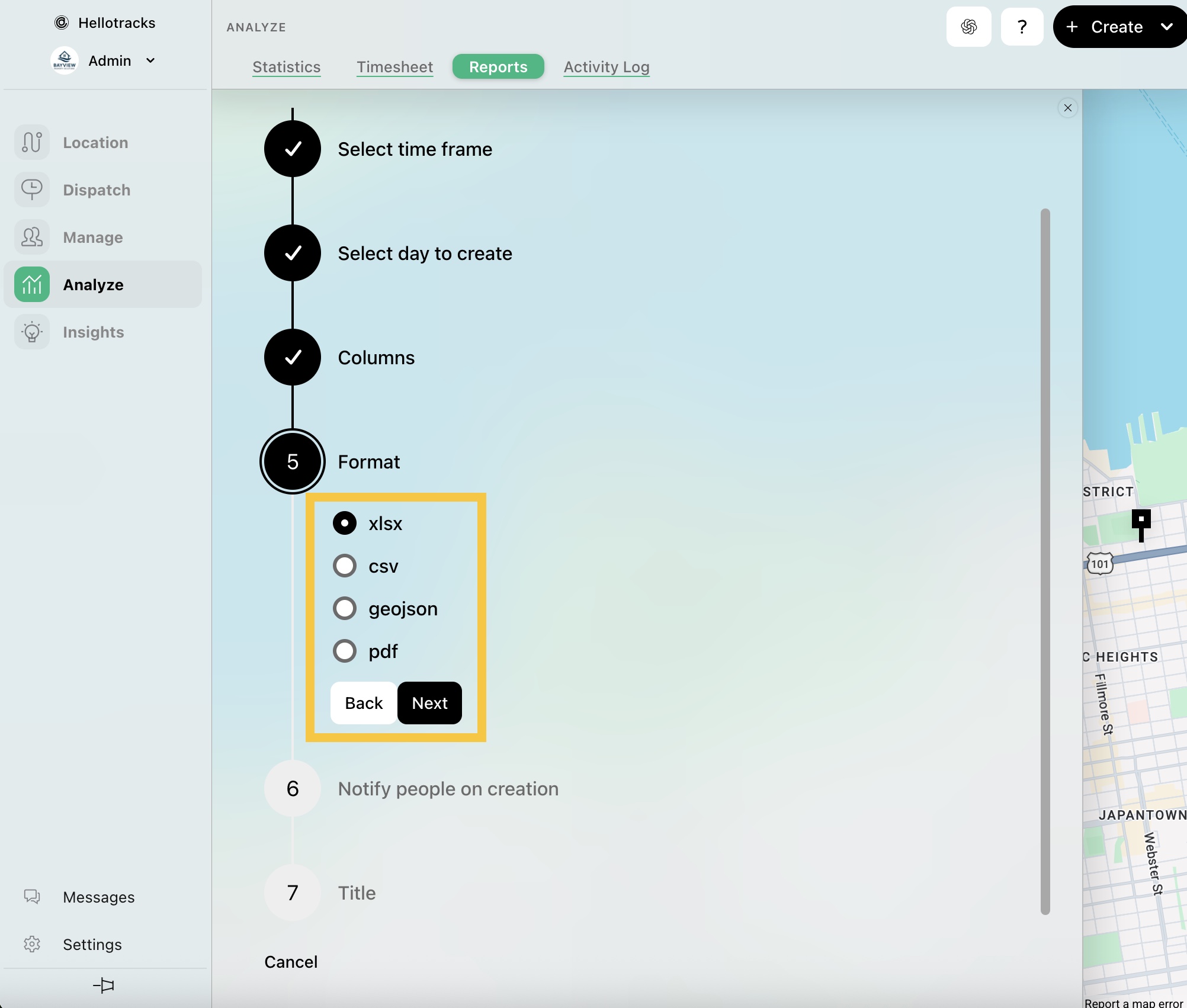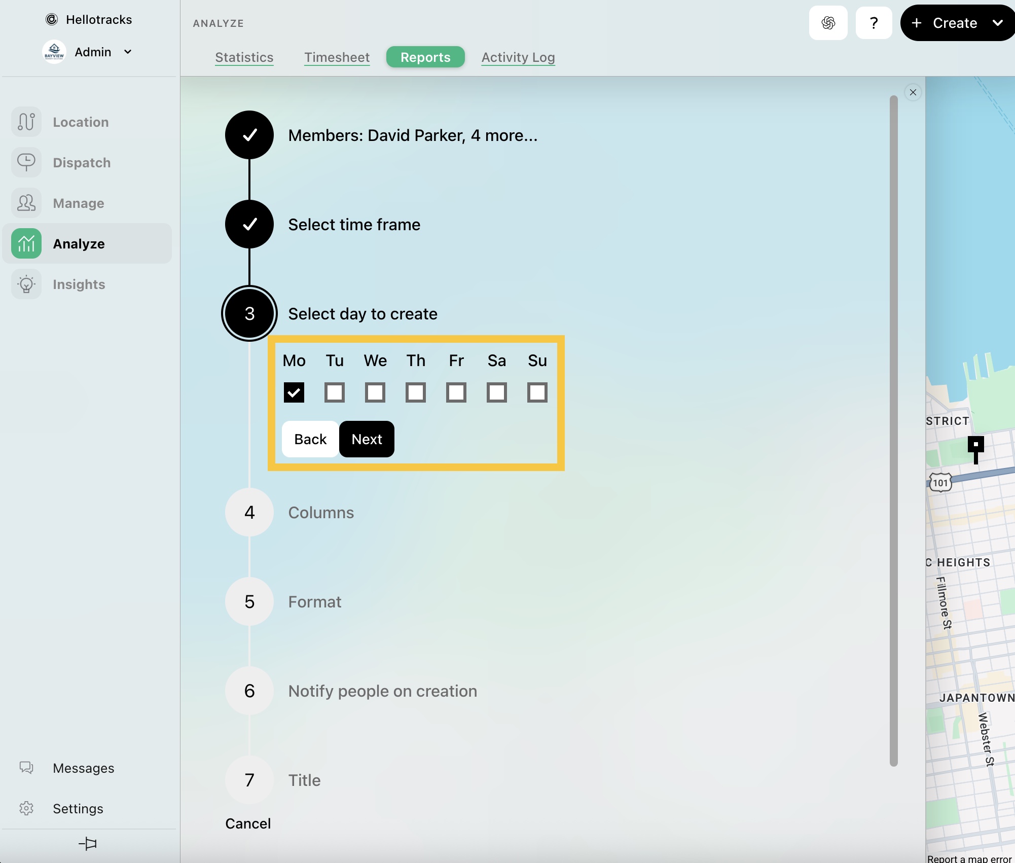 Step 7: Select the day(s) of the week the report will be created, then click Next.