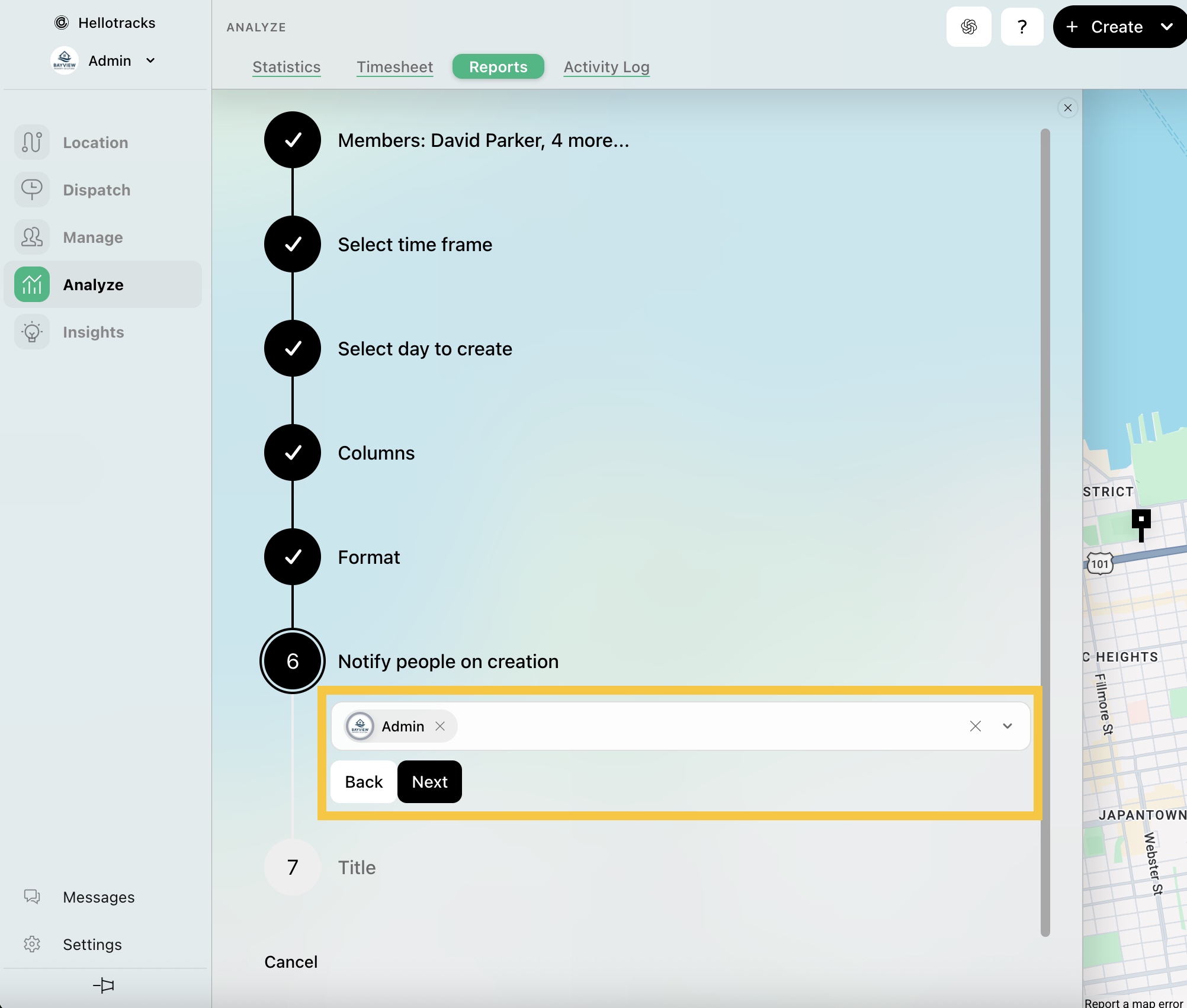Step 10: Select the member(s) who should receive the notification when the report is created, then click Next.