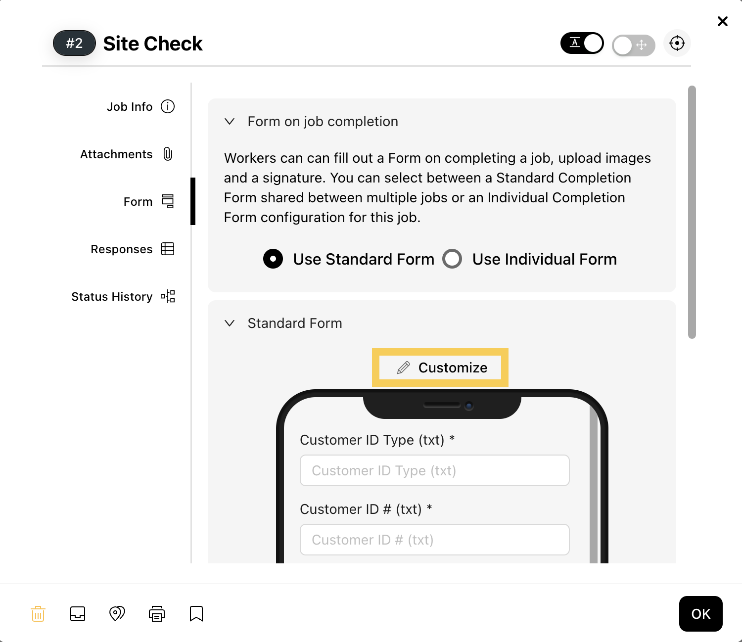 You can customize the form that workers complete upon job completion to collect specific data for each task. There are two types of forms you can use and customize: