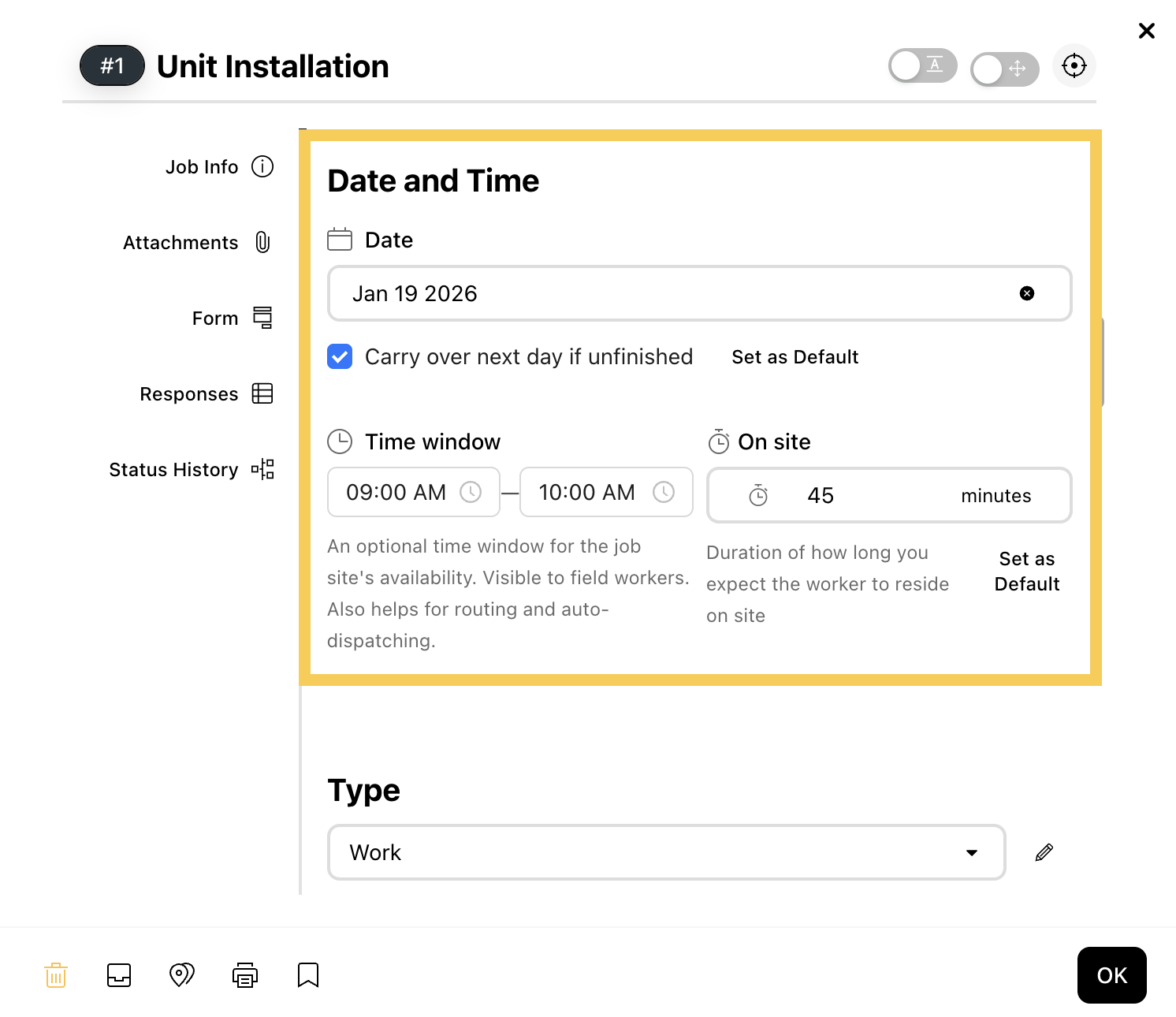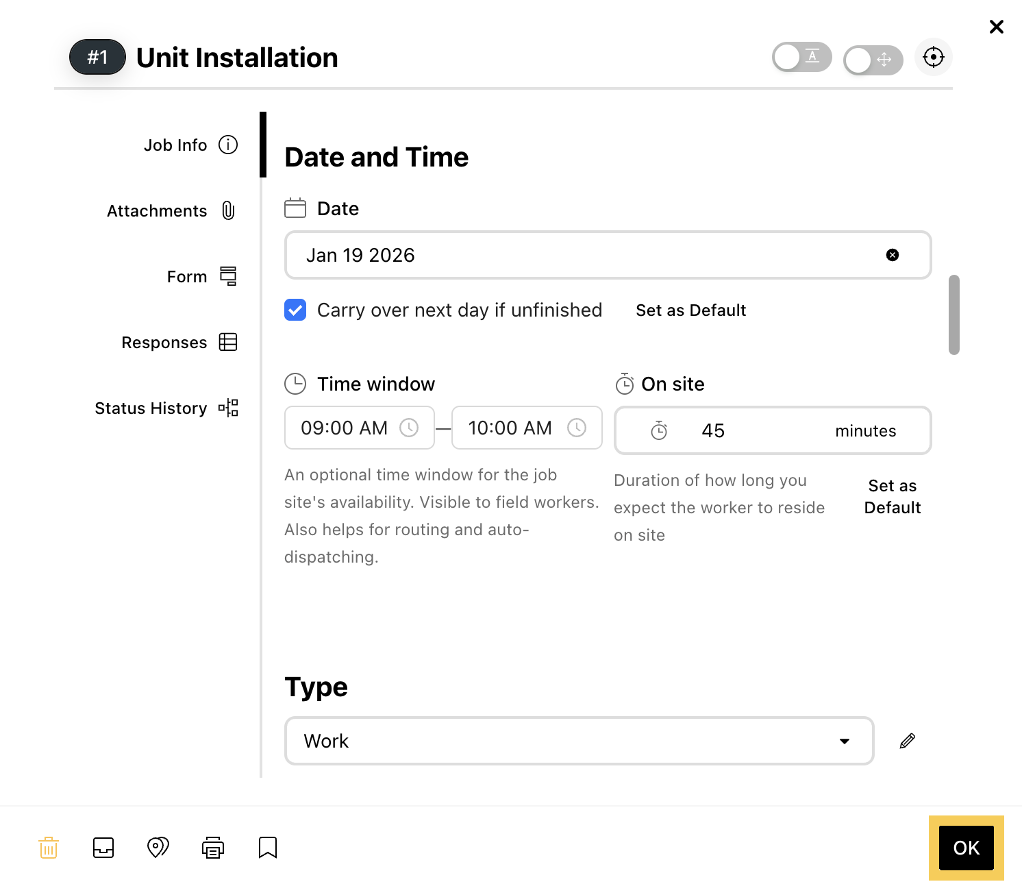 - Here, you can also adjust the "Time window" and the "On site" duration for the job as needed.