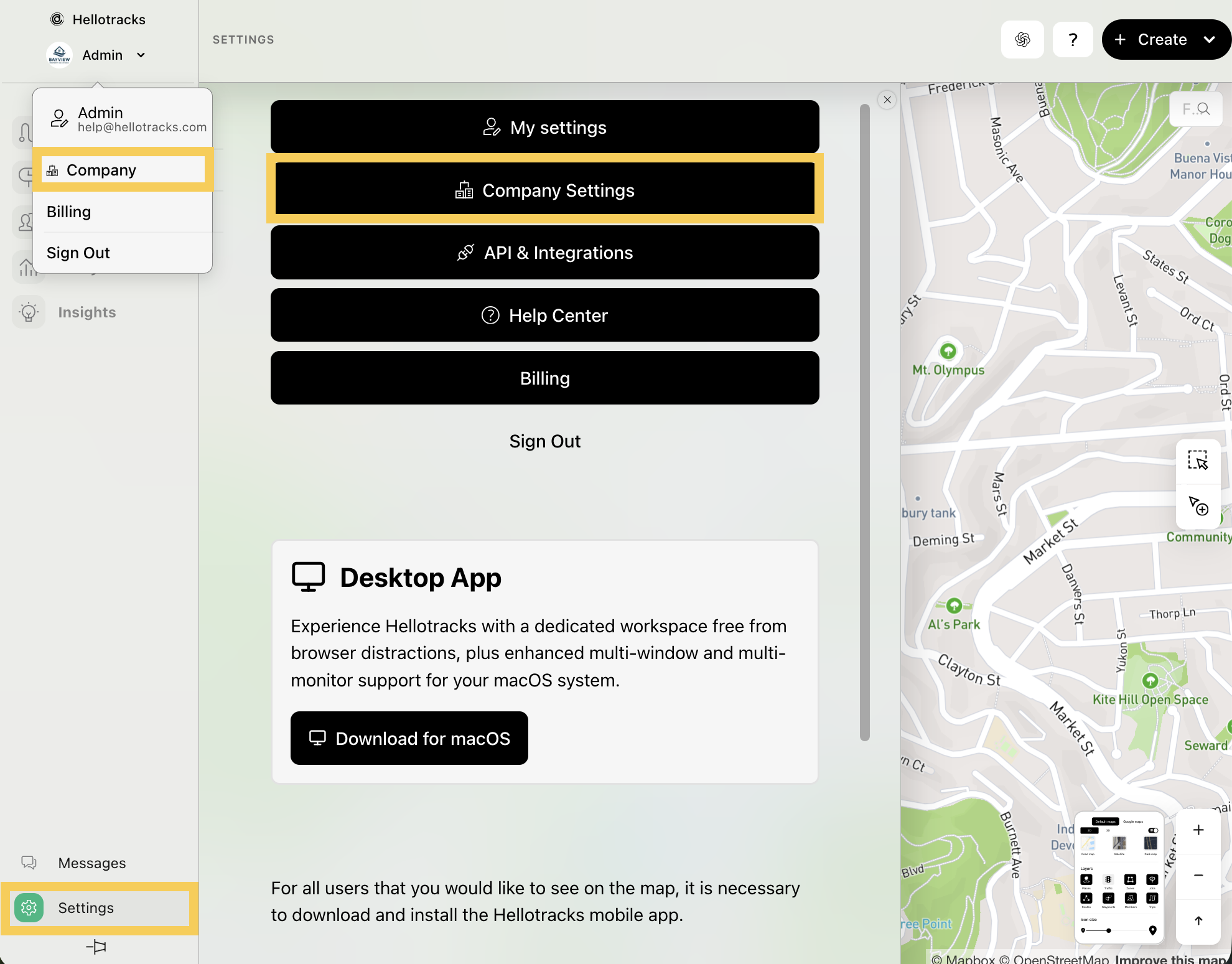 Step 1: Go to Settings. Click the dropdown menu under your profile and select Company. Alternatively, you can go to Settings at the bottom of the main menu and select Company Settings.