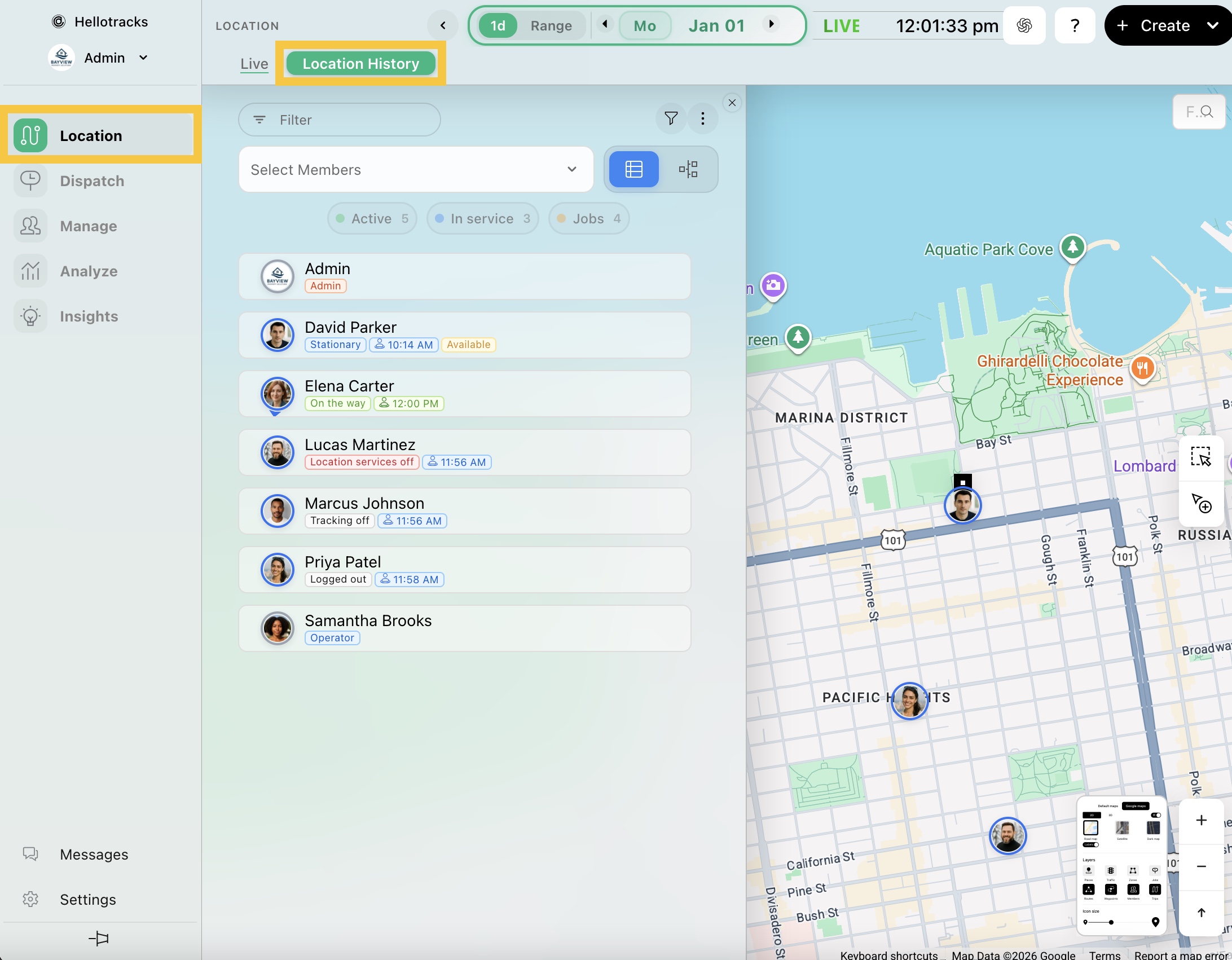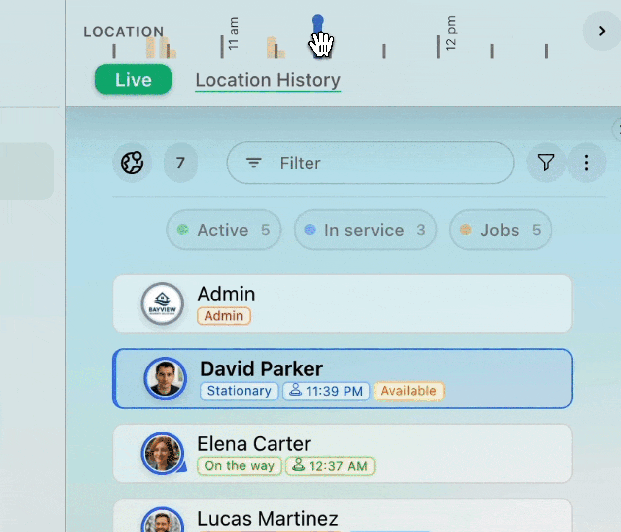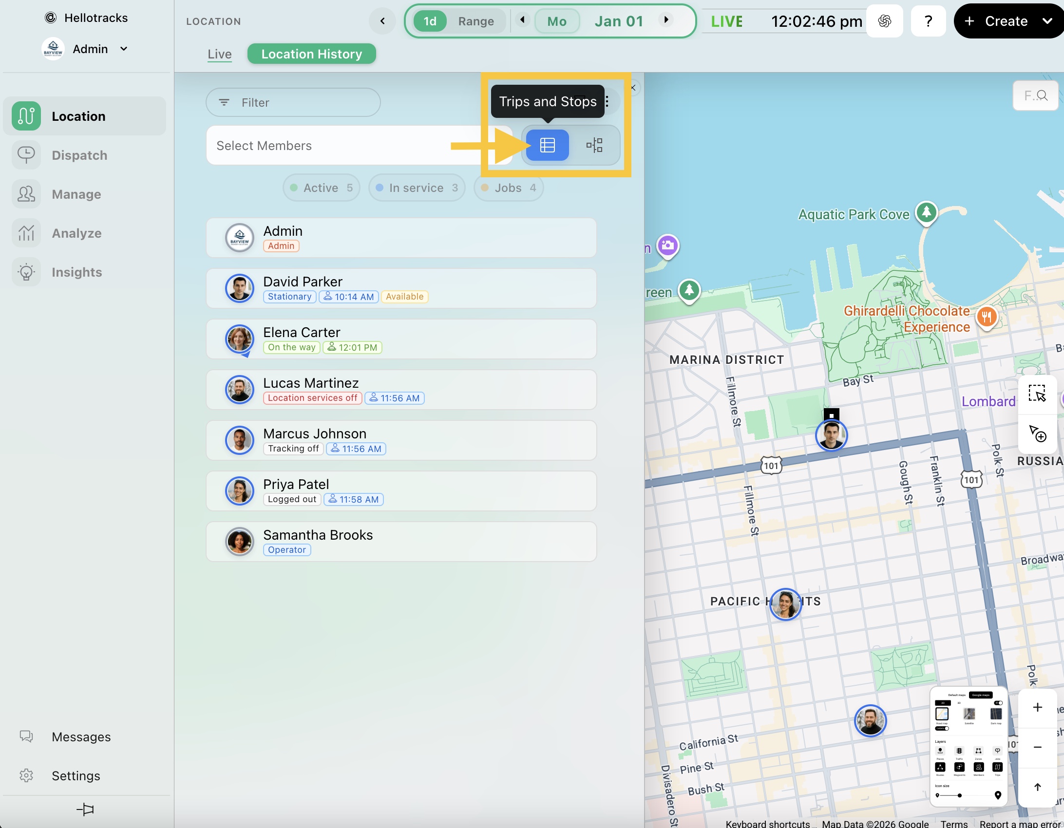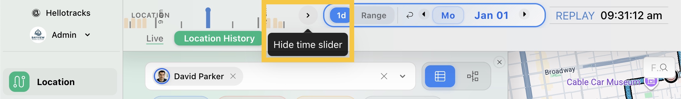 Time Slider allows you to review your team members’ movements on the map at a specific time. Move backward or forward in time to see where members were located, how they moved, and when trips and stops occurred.