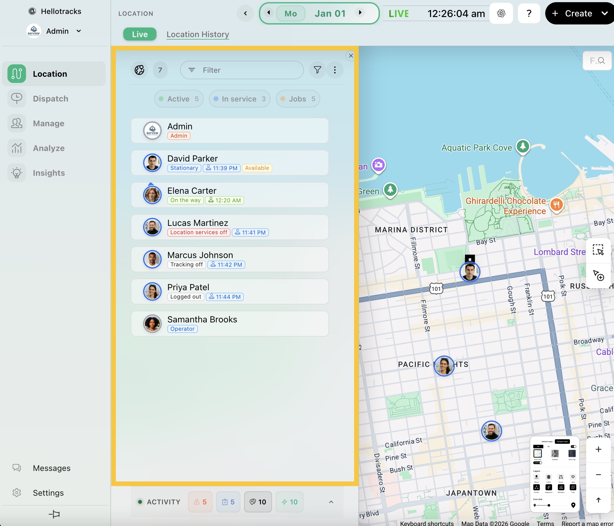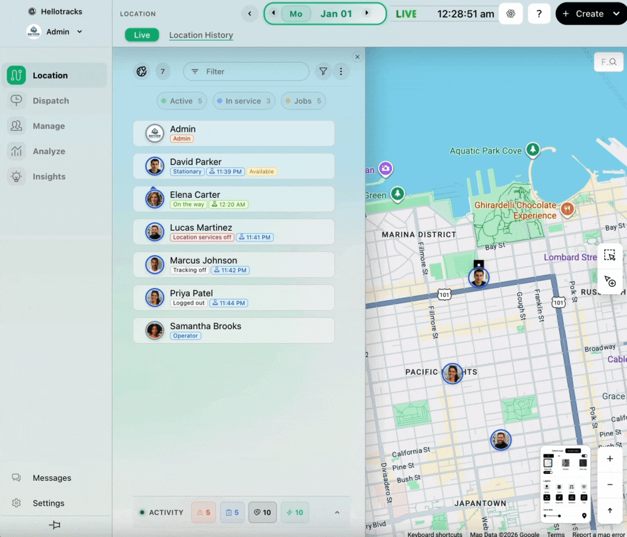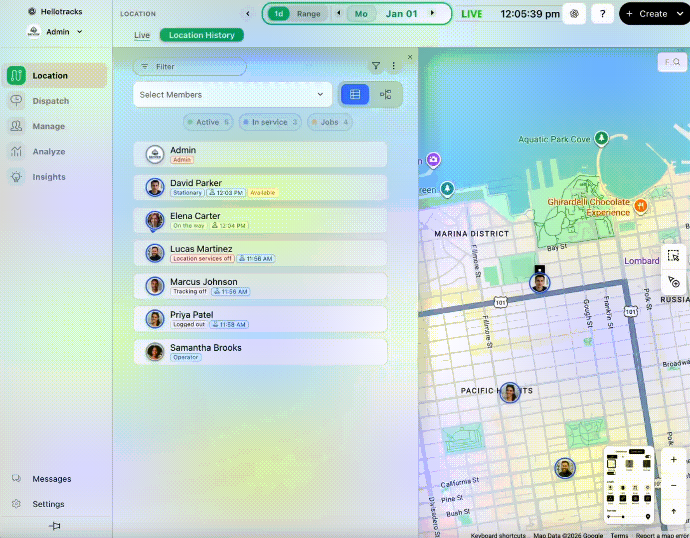 Time Slider allows you to review your team members’ movements on the map at a specific time. Move backward or forward in time to see where members were located, how they moved, and when trips and stops occurred.