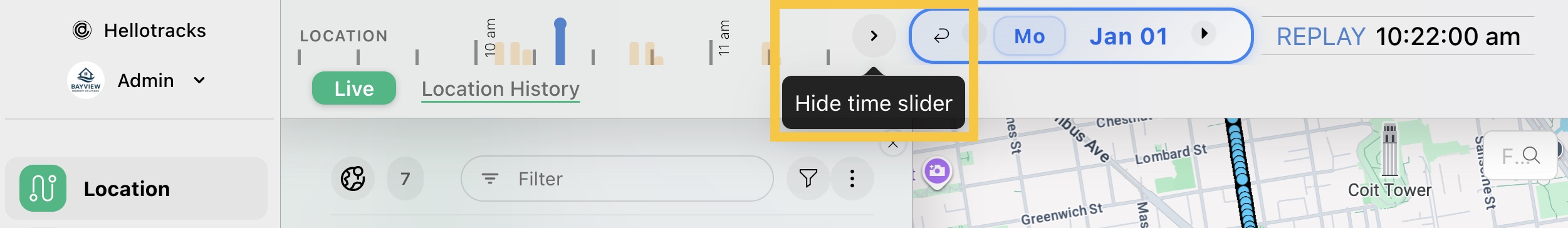 Step 5: Click the forward arrow (>) at the top to return to the Live map (real-time view) and hide the Time Slider.