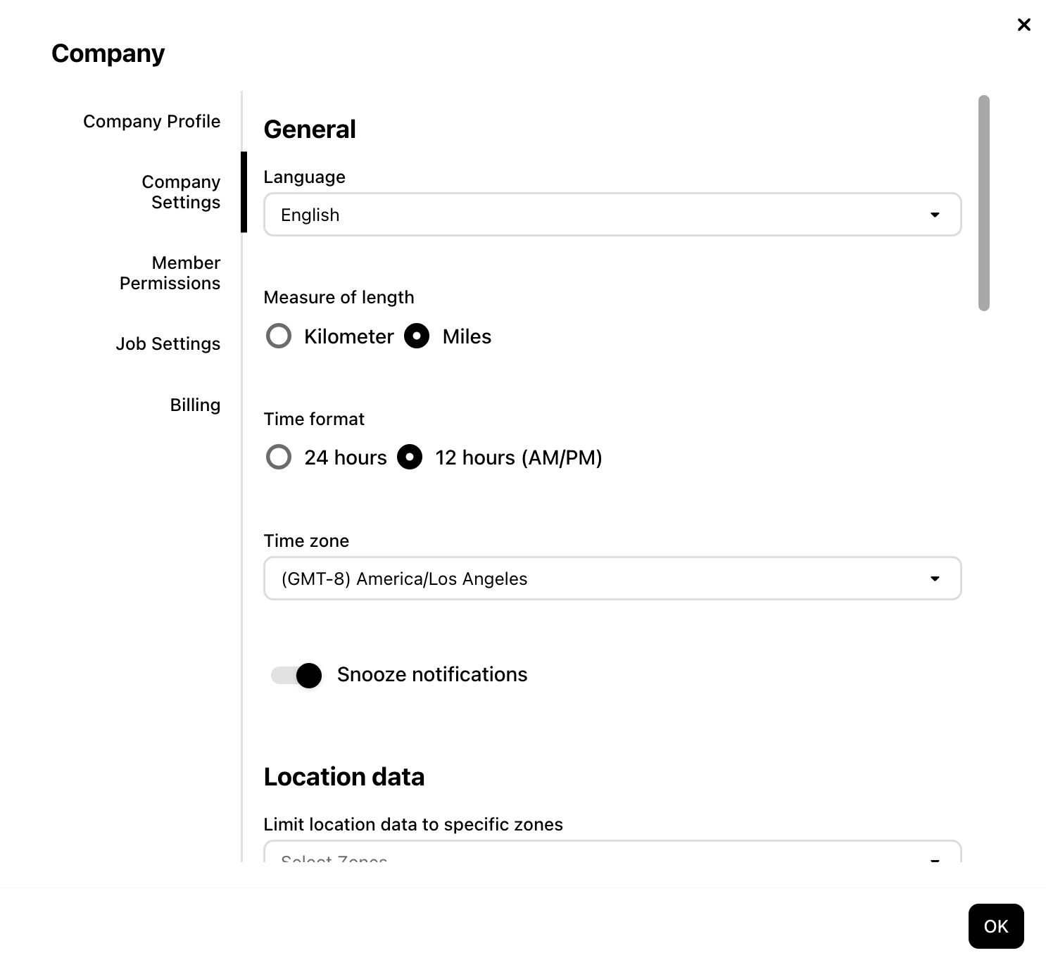 - Language: Use the dropdown menu to select your preferred language. Hellotracks is available in English, Spanish, and German.