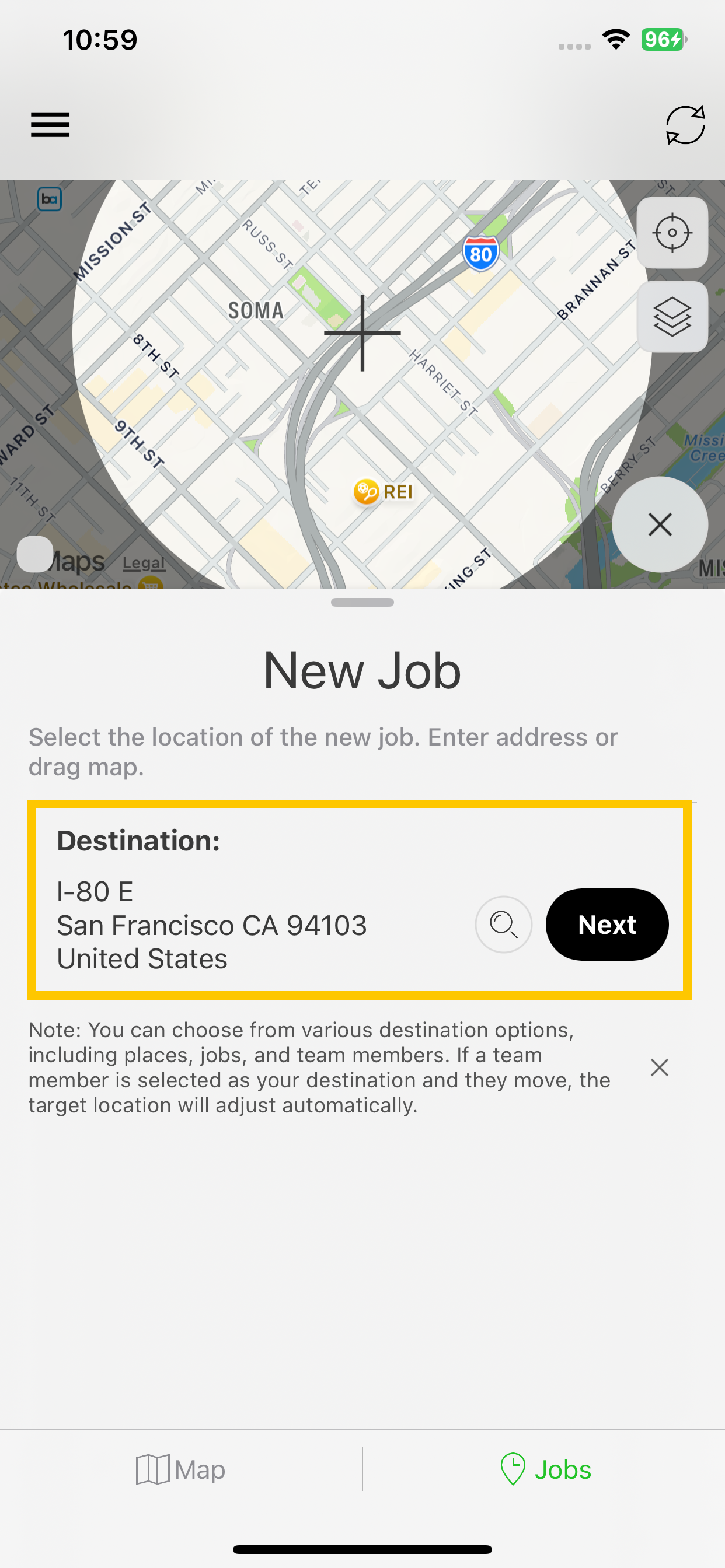 Step 4: Add the Destination for the Job. You can either drag the map to the desired location or use the search button to find a specific address. Once the location is set, tap Next.