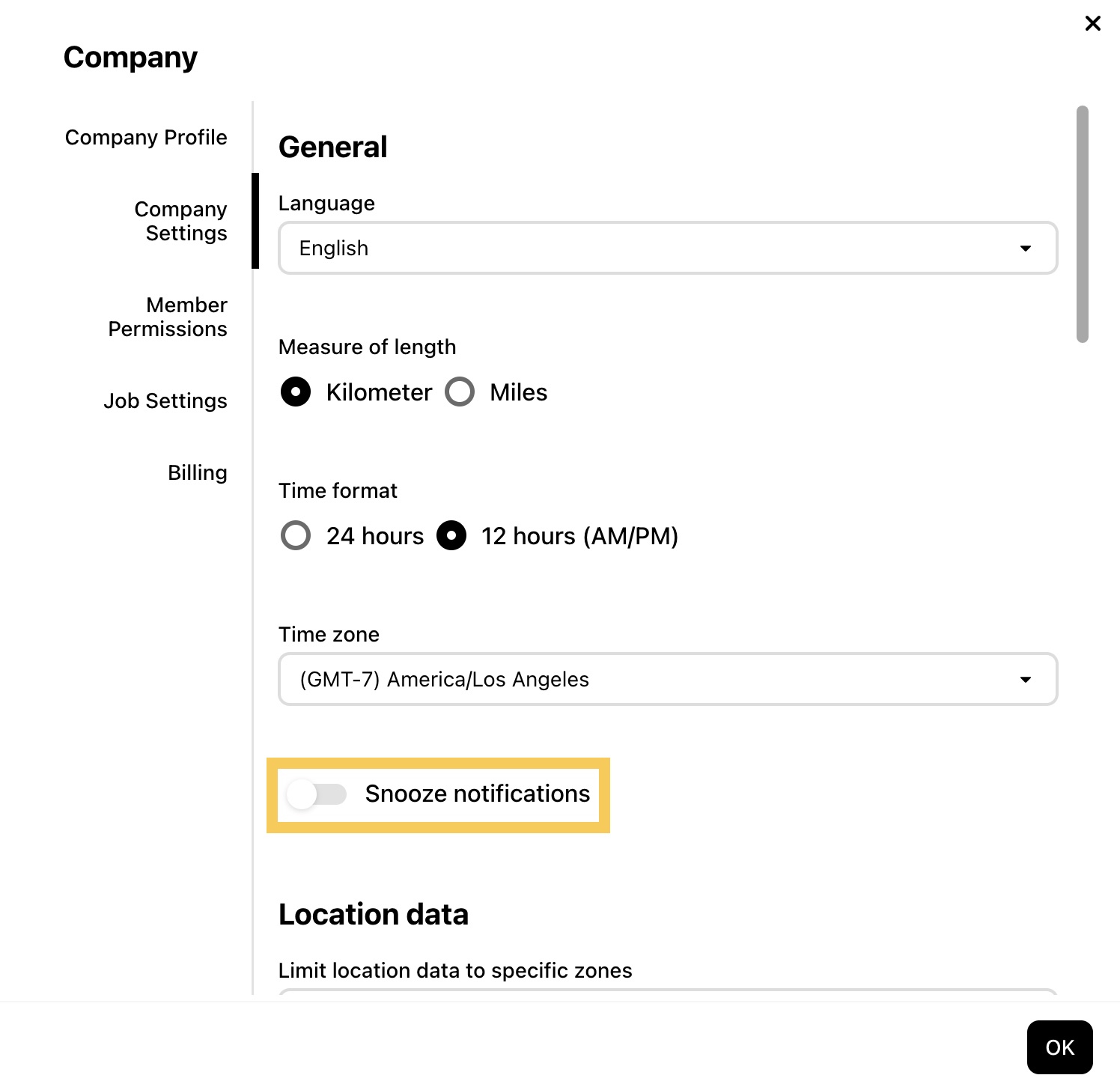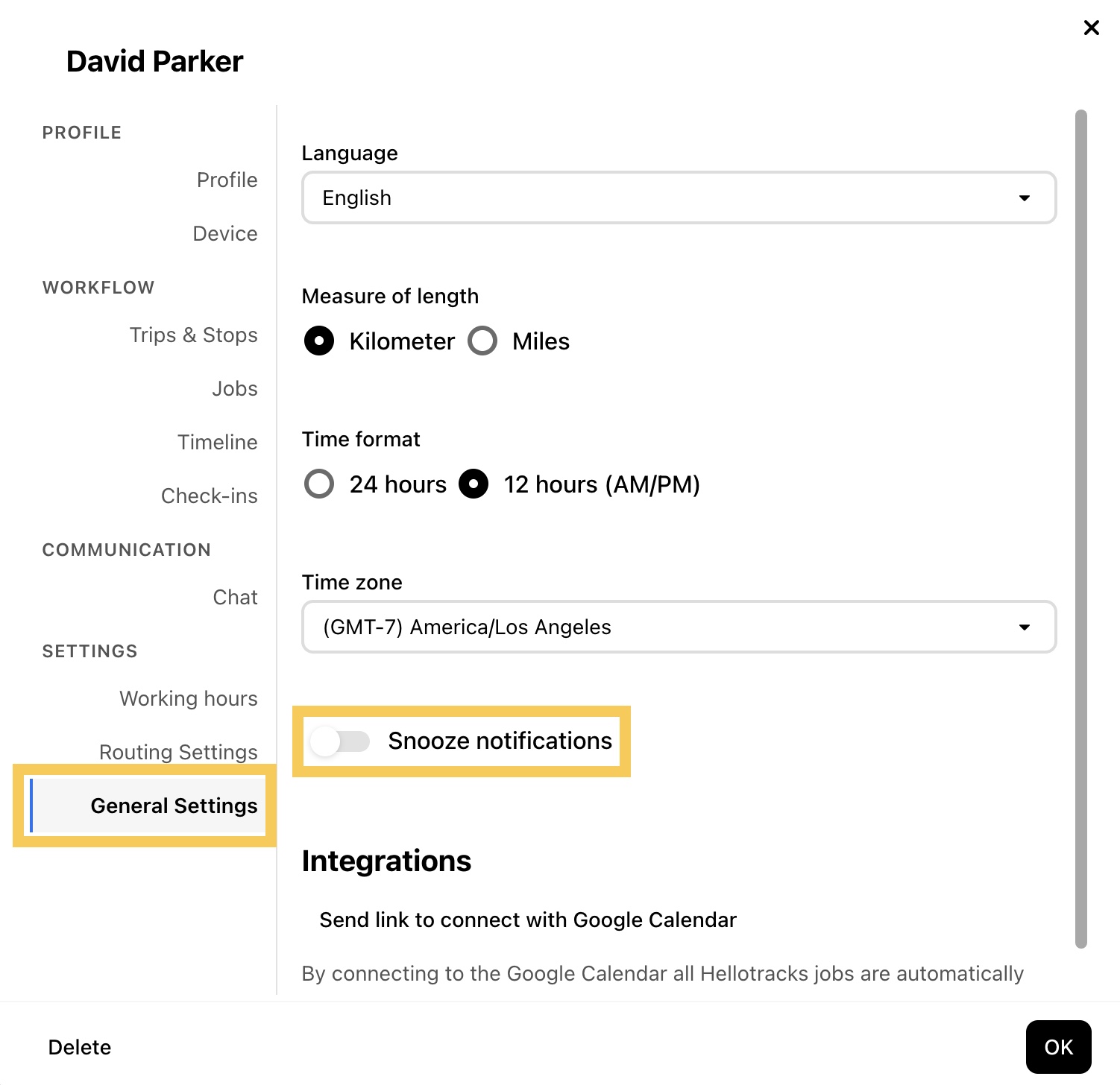 Step 4: Snooze notifications also appear in each user profile under General Settings. This setting applies to all users.
