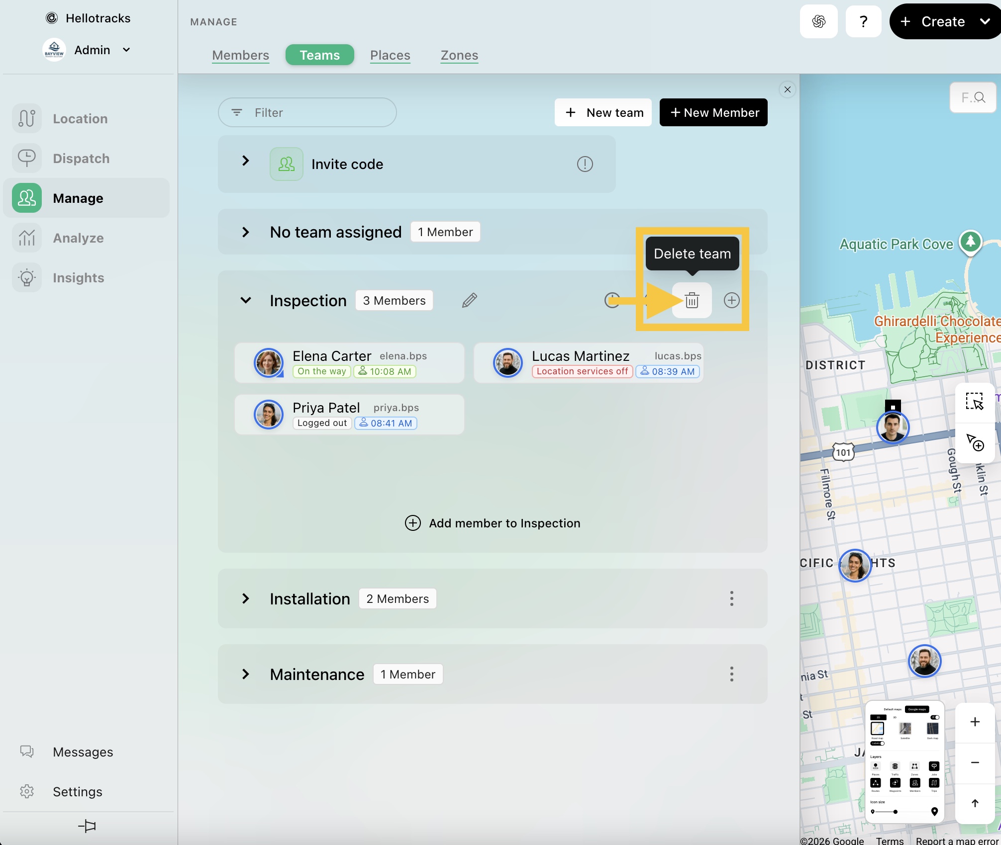 Step 2: Hover over the team to reveal the delete icon, then click it and select Delete to confirm.