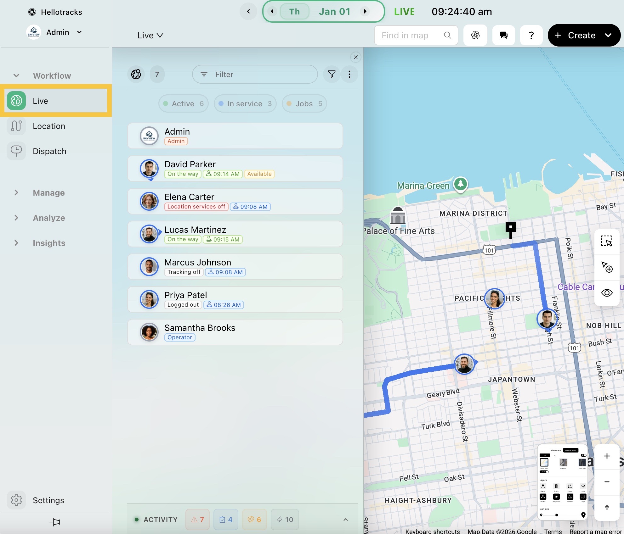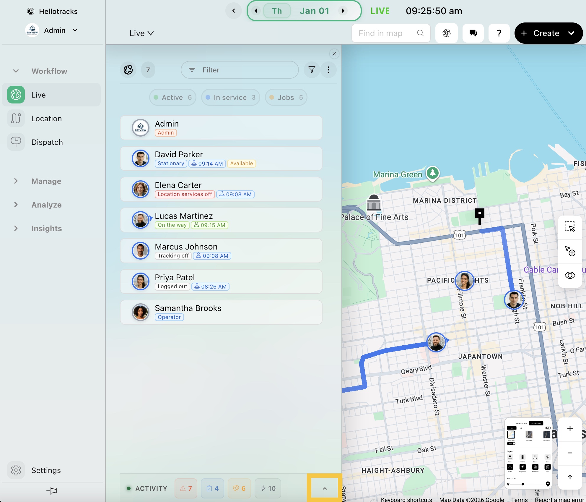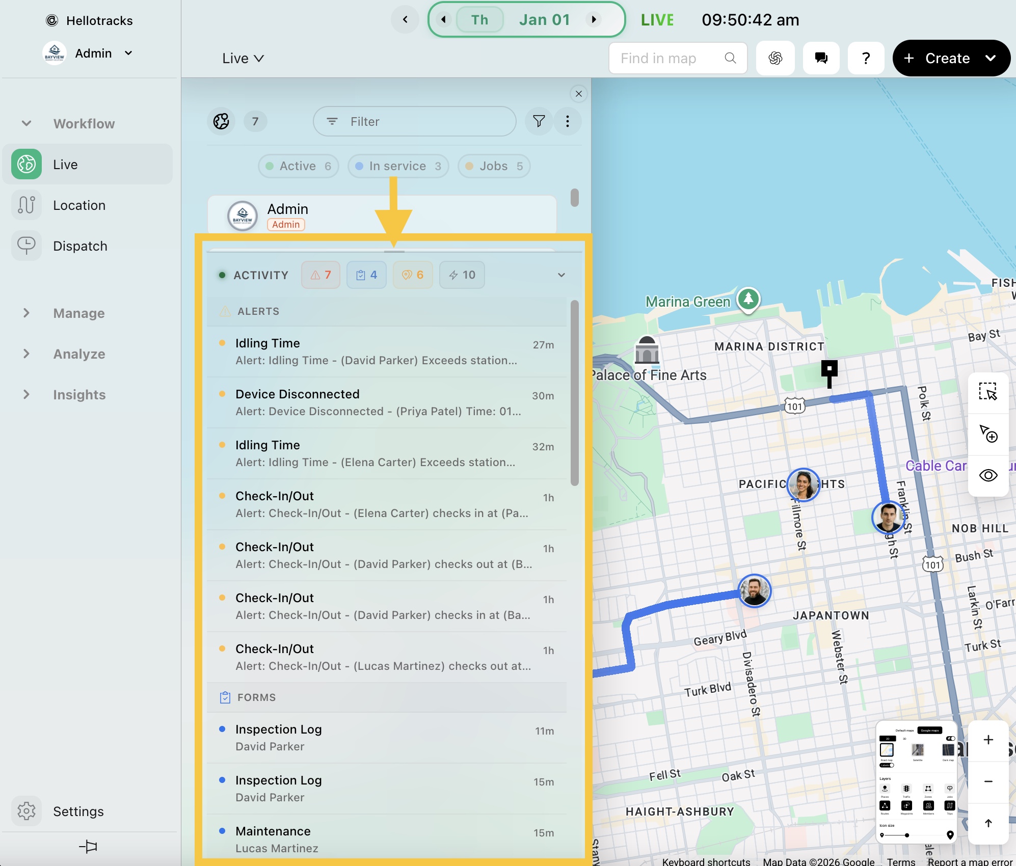 The Activity panel shows the most recent alerts, job updates, form submissions, and activity events from your team members. This helps you quickly monitor what’s happening in real time while keeping the Live map visible.