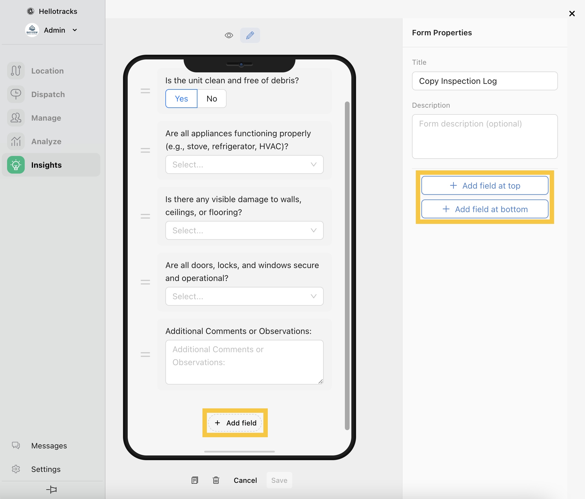Step 6: To add a field, click + Add field at top or + Add field at bottom, or use + Add field in the mobile preview.