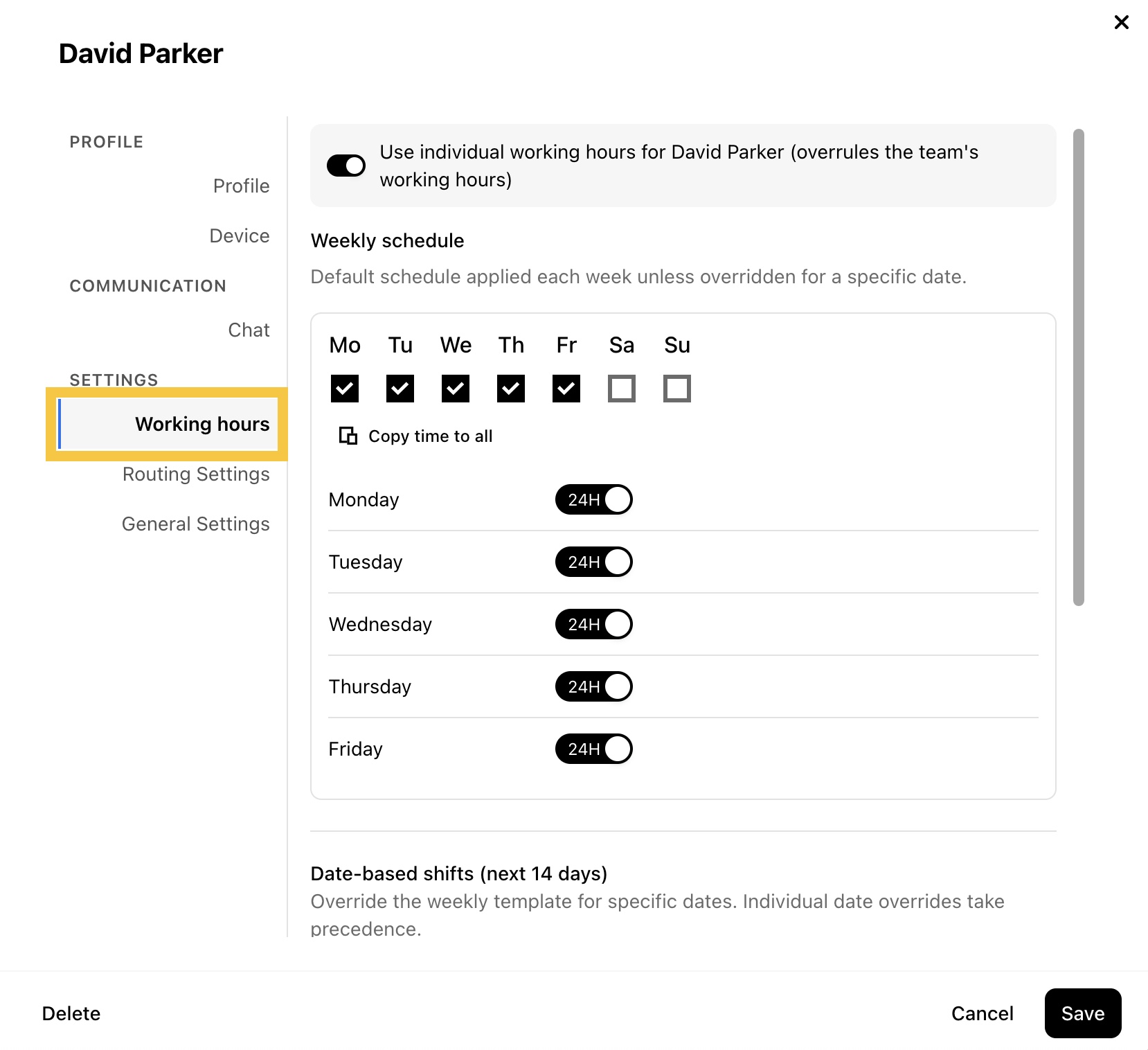 Note: If Date-based shifts (next 14 days) is not visible, make sure Use individual working hours is enabled for the member.