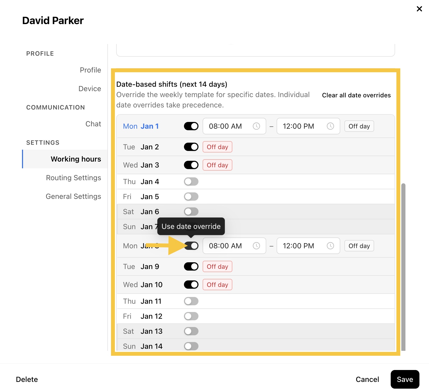Step 4: In Date-based shifts (next 14 days), enable the date you want to override, then set the working hours for that day or select Off day.