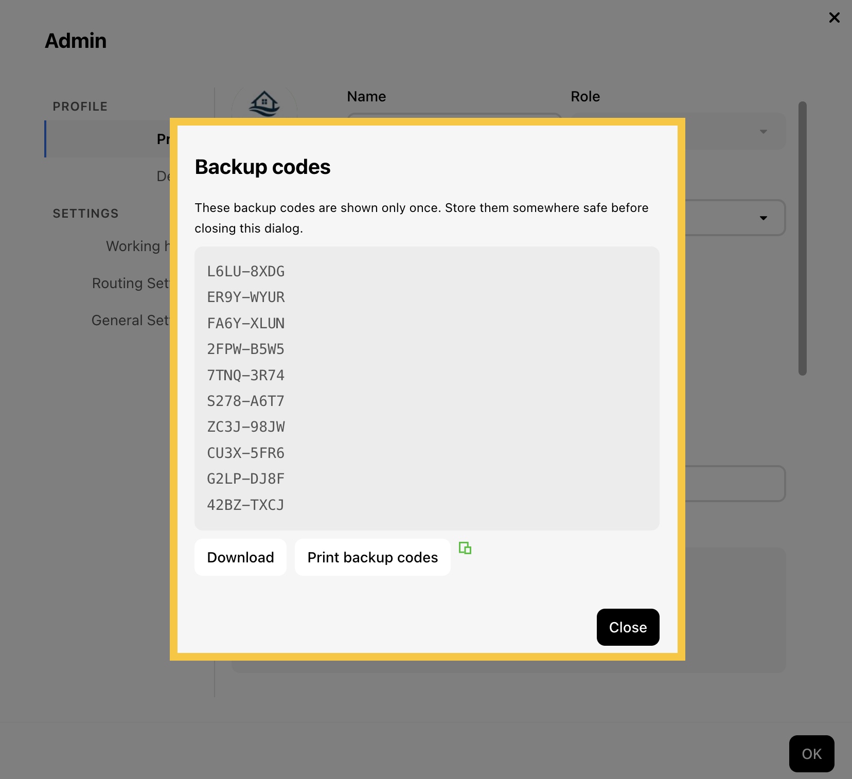 Note: Be sure to download, print, or copy your new backup codes and store them in a secure place before closing the window.