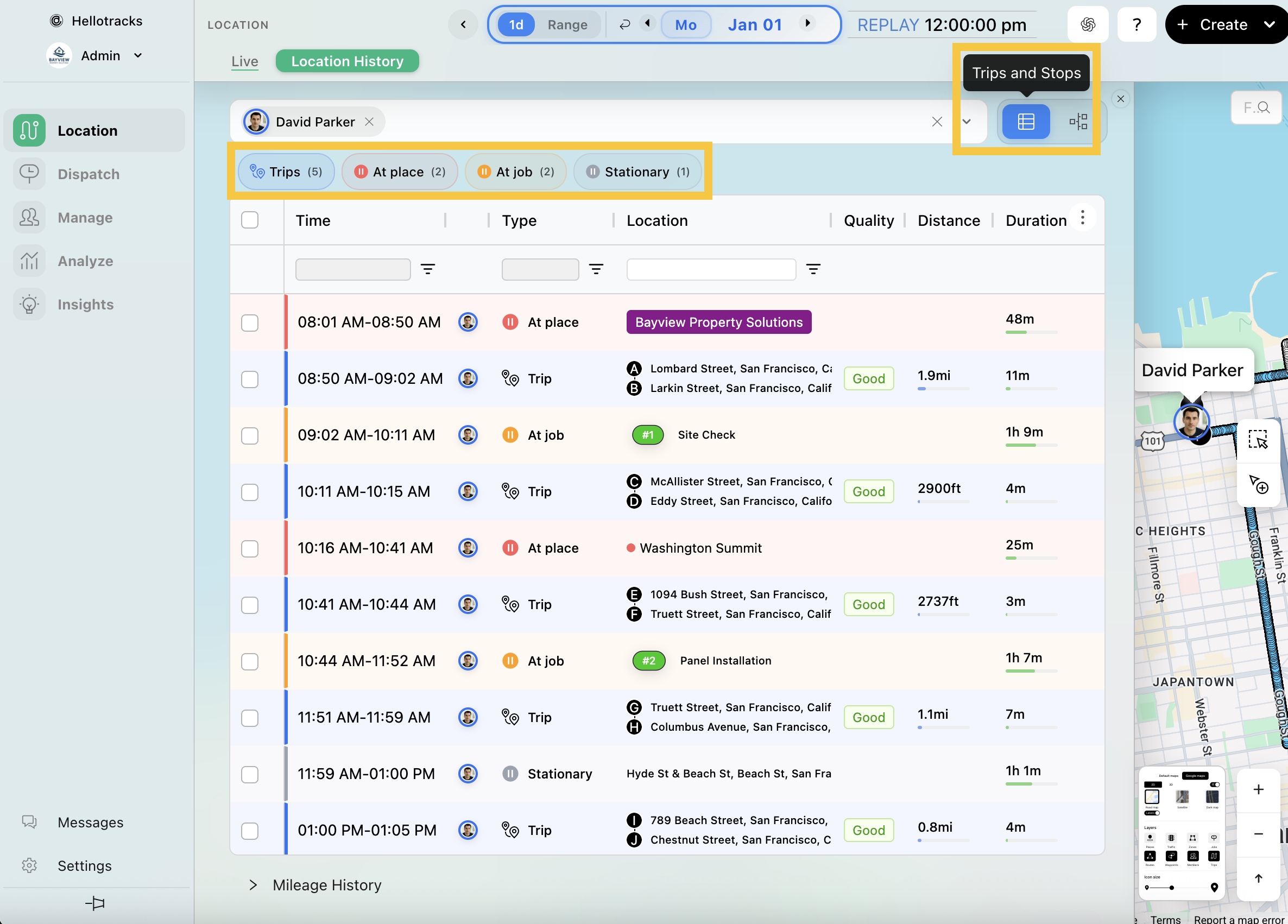 Trips show movement during the day, while Stops show pauses and time spent at locations, categorized as At place, At job, or Stationary (outside defined locations).