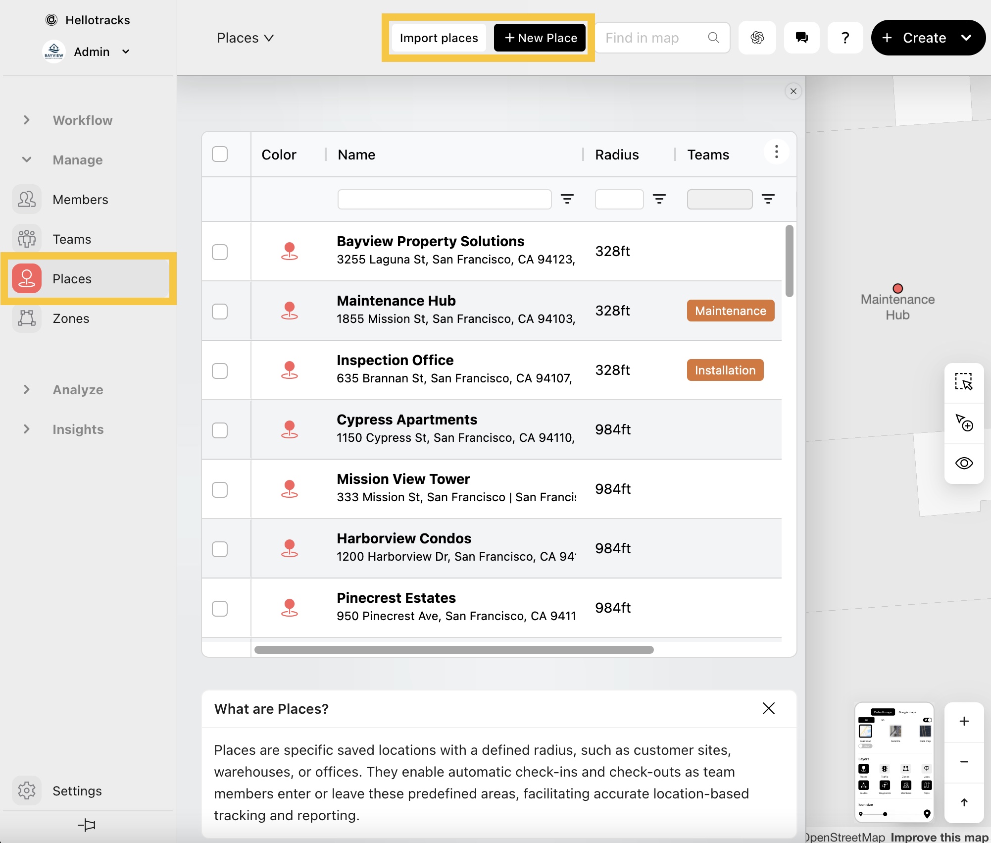 From Manage, go to Places and click on + New Place to add a new geofence. If you want to add multiple locations, you can use the spreadsheet available or download the template on Import places.