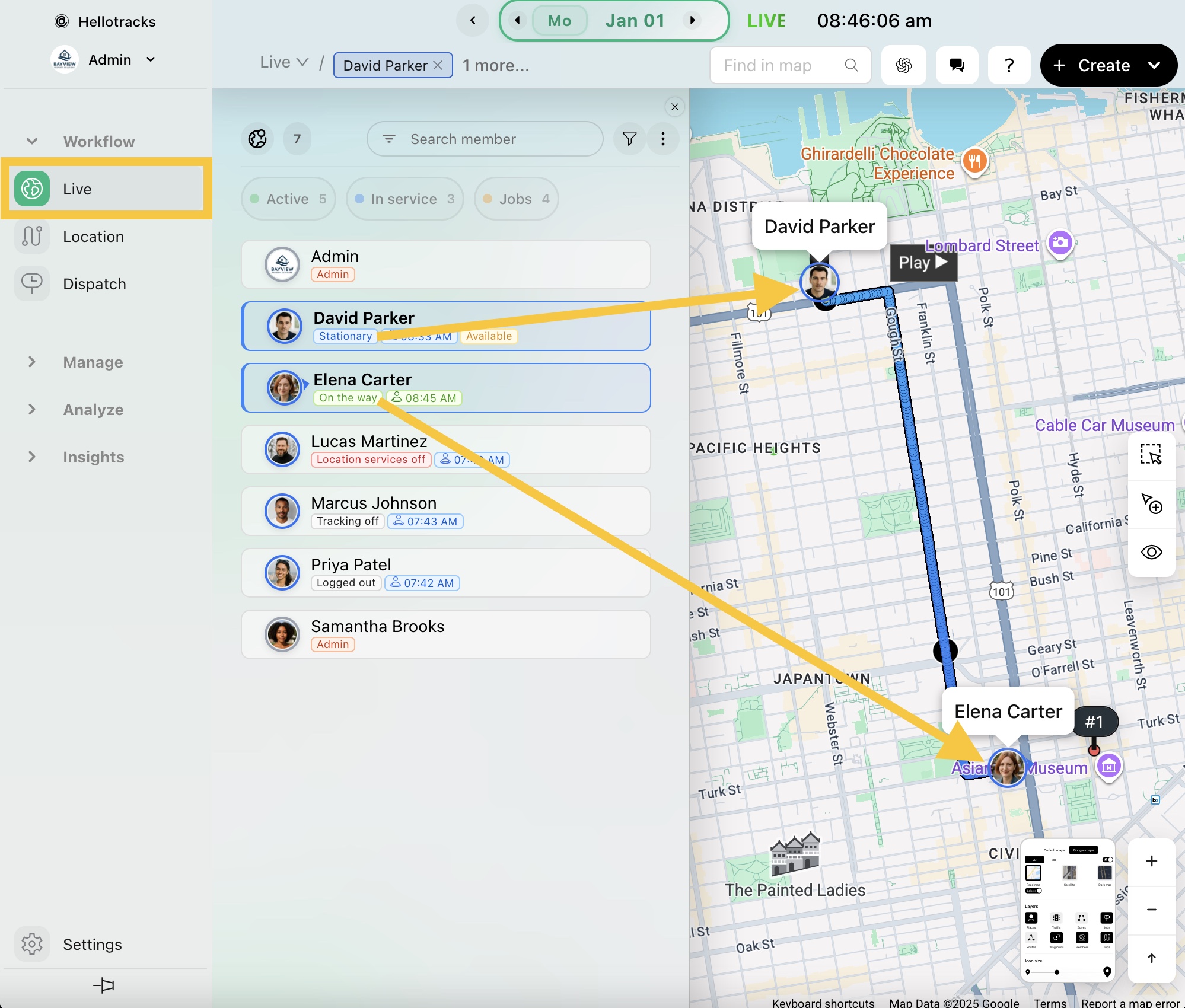 All users that activate the mobile app will appear on the Live map. You will be able to follow them in real-time from the Live map and see each user’s status, e.g. stationary or on the way.