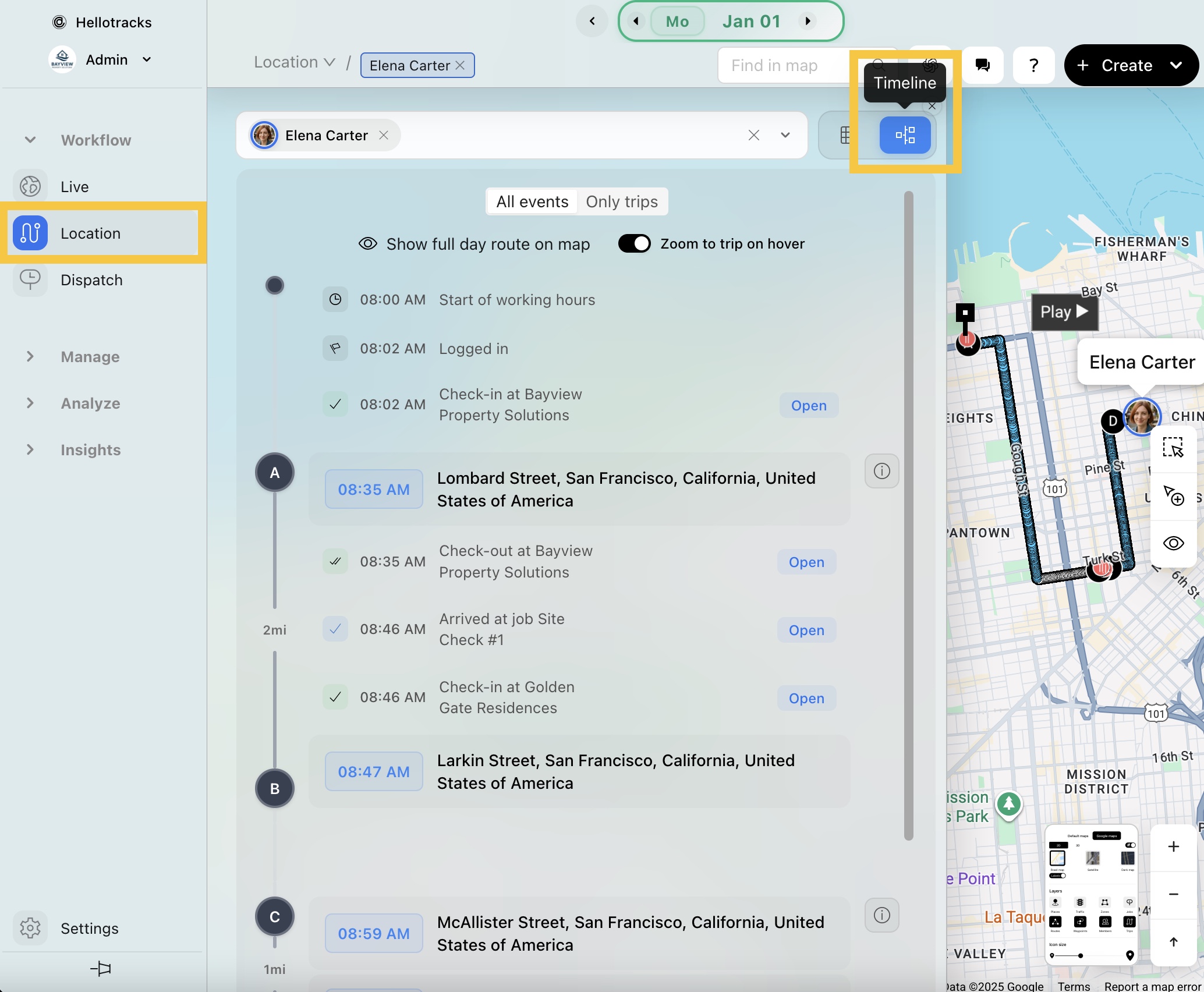 In addition, you can switch to the Timeline view, which shows a chronological overview of all their activity throughout the day.