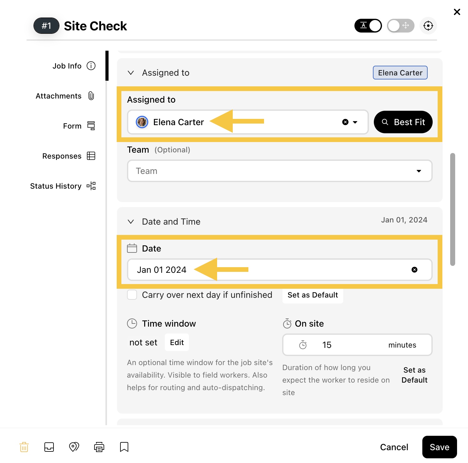 Select the Worker and the assigned date for the new Job. After creation, the Job will appear in the mobile app for the Worker to complete in the field.