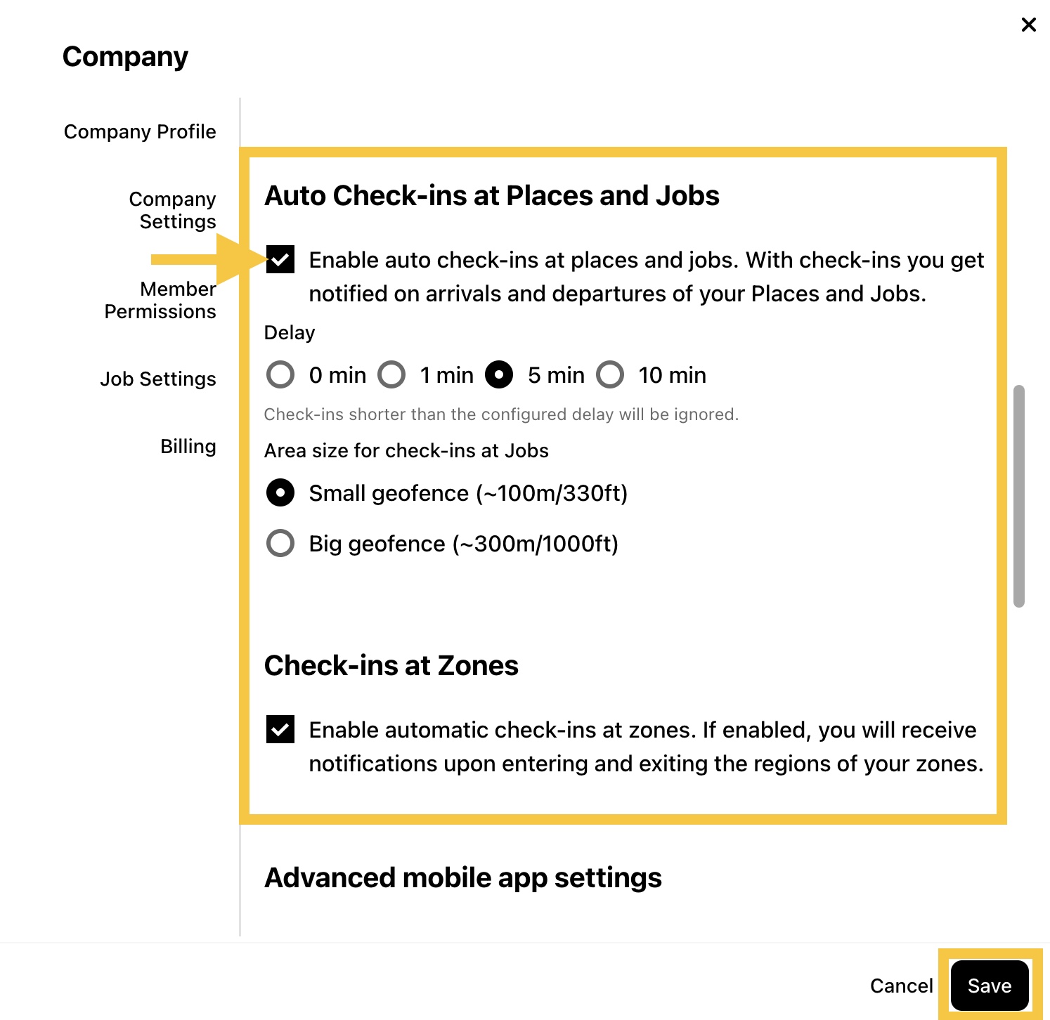 Step 3: In Auto Check-ins at Places and Jobs, check the box to enable automatic check-ins/outs. Adjust the settings for delay, area size, and Zone check-ins as needed, then click Save.