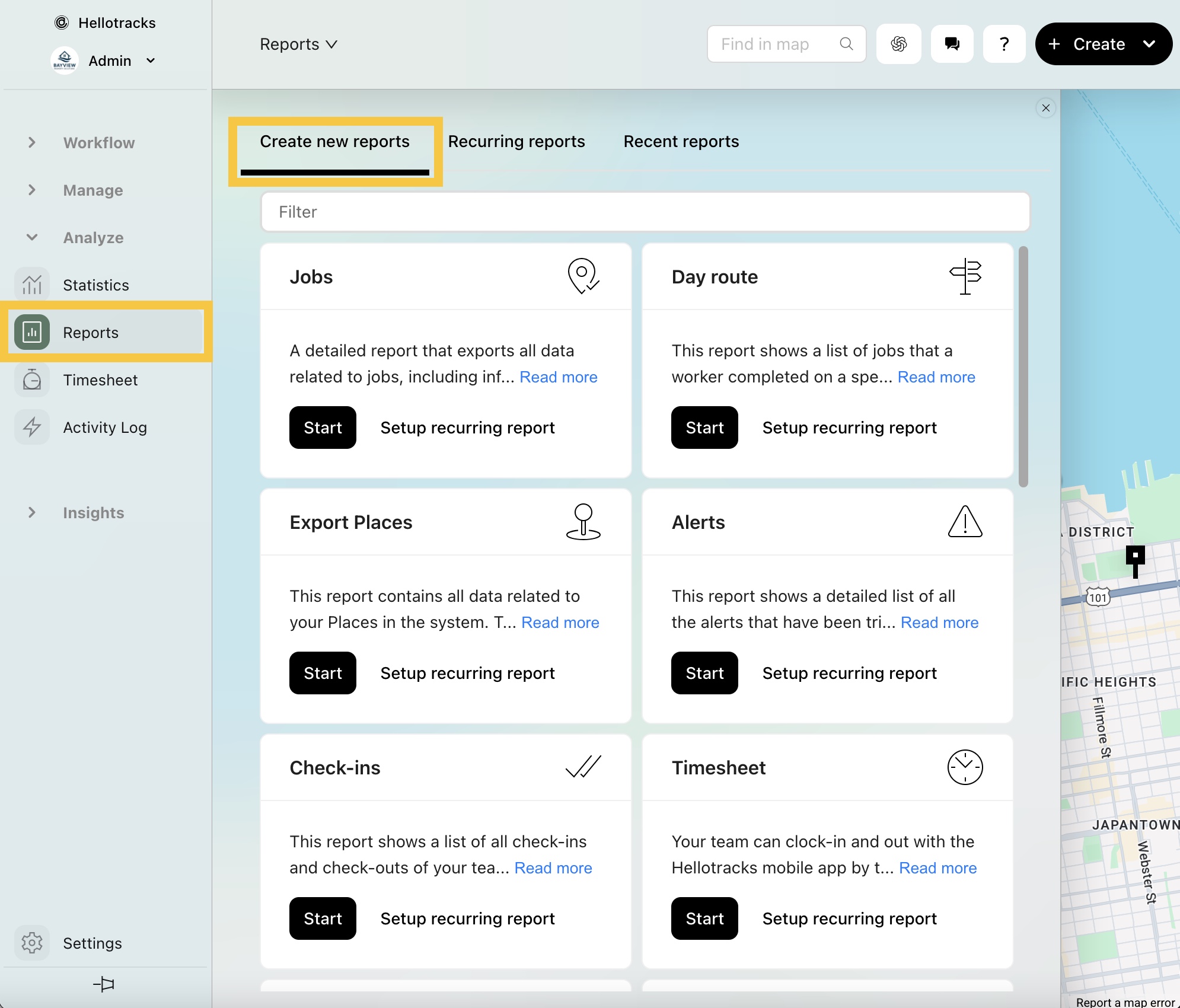 Step 5: To export the data, go to Reports from the Analyze section of the main menu. Then, select Create new reports.