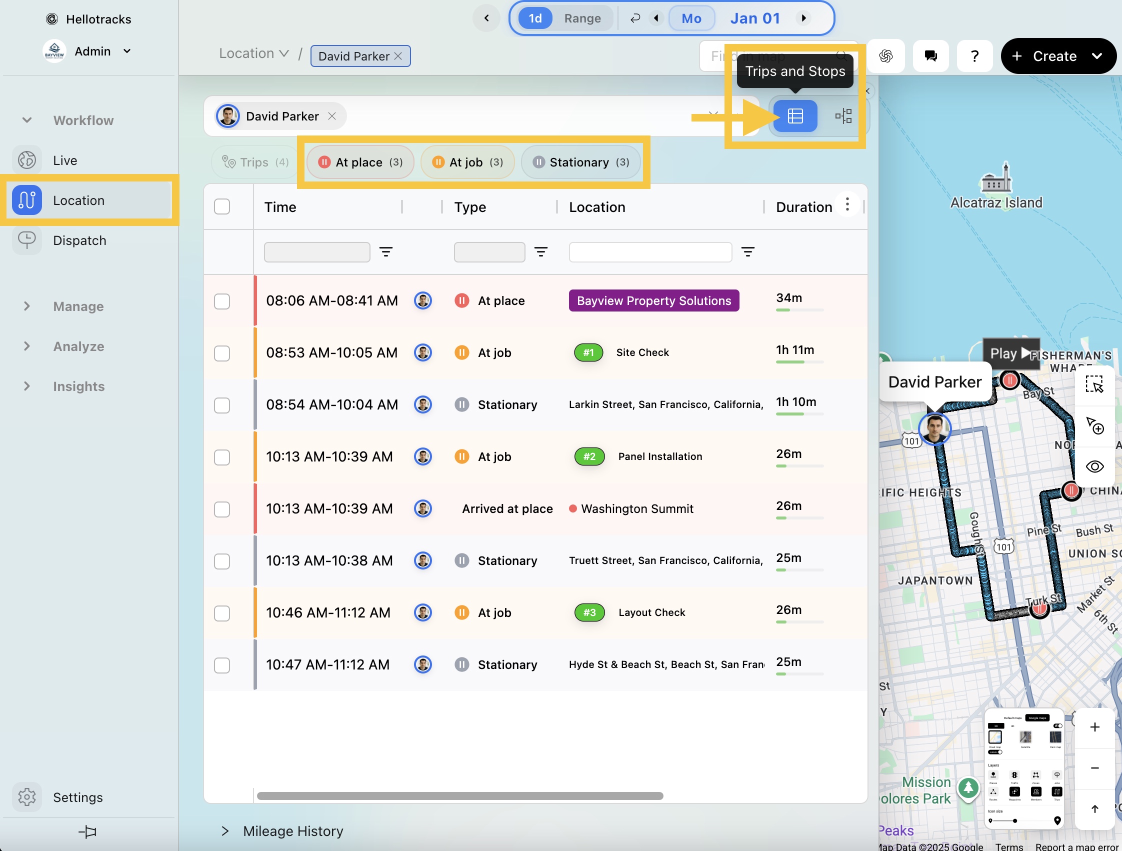 - Location - Trips and Stops (At place / At job / Stationary)