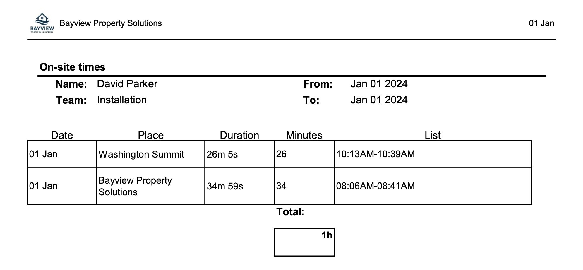 - On-site times of your team