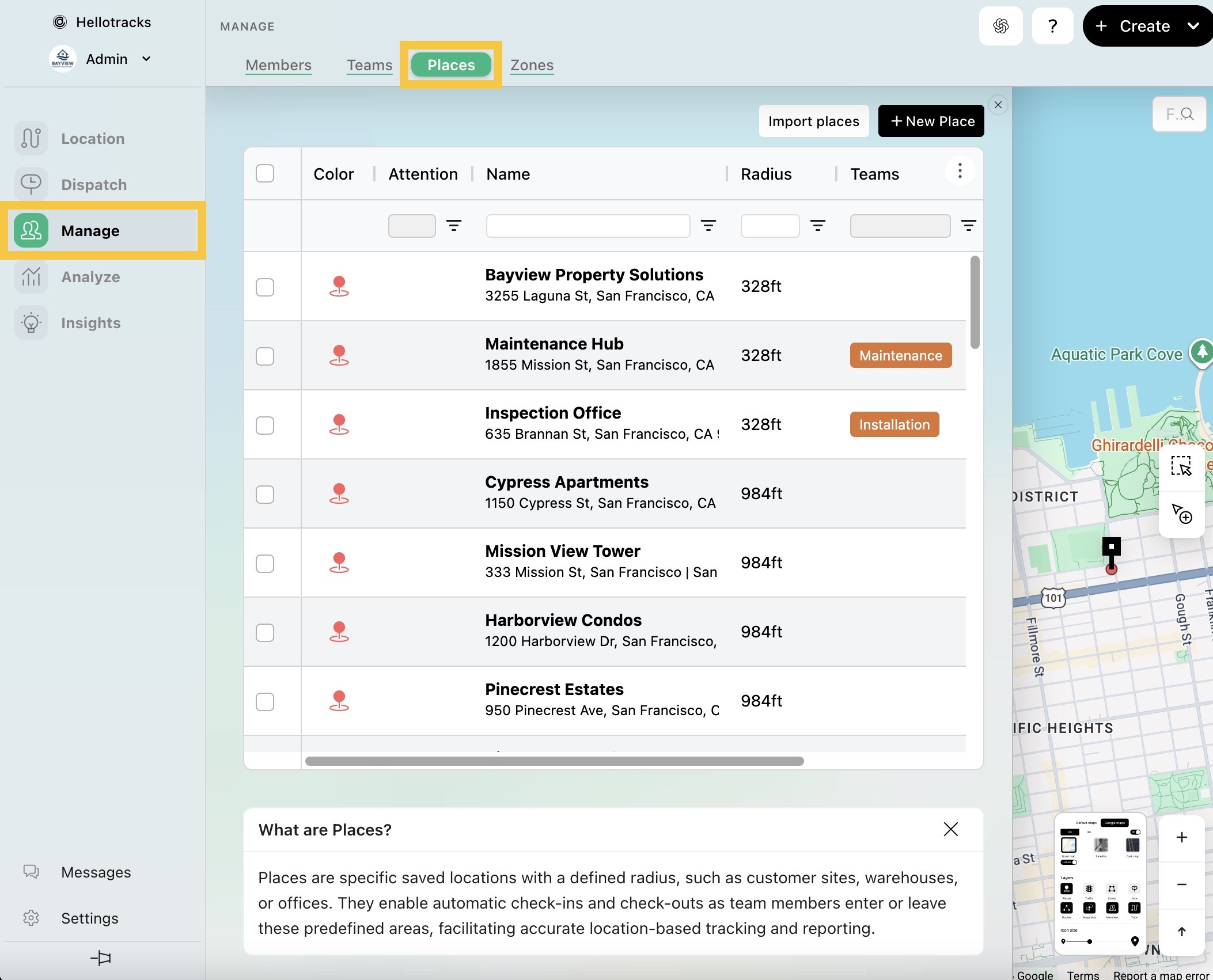 Places are specific saved locations with a defined radius, such as customer sites, warehouses, or offices. They enable automatic check-ins and check-outs as team members enter or leave these predefined areas, facilitating accurate location-based tracking and reporting.