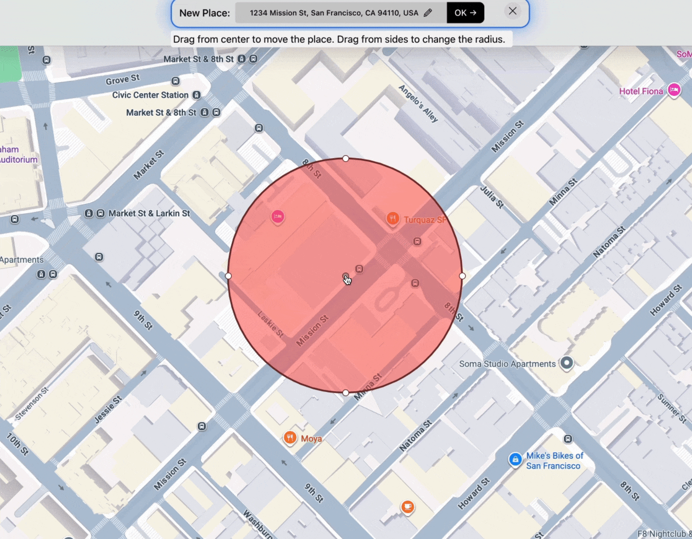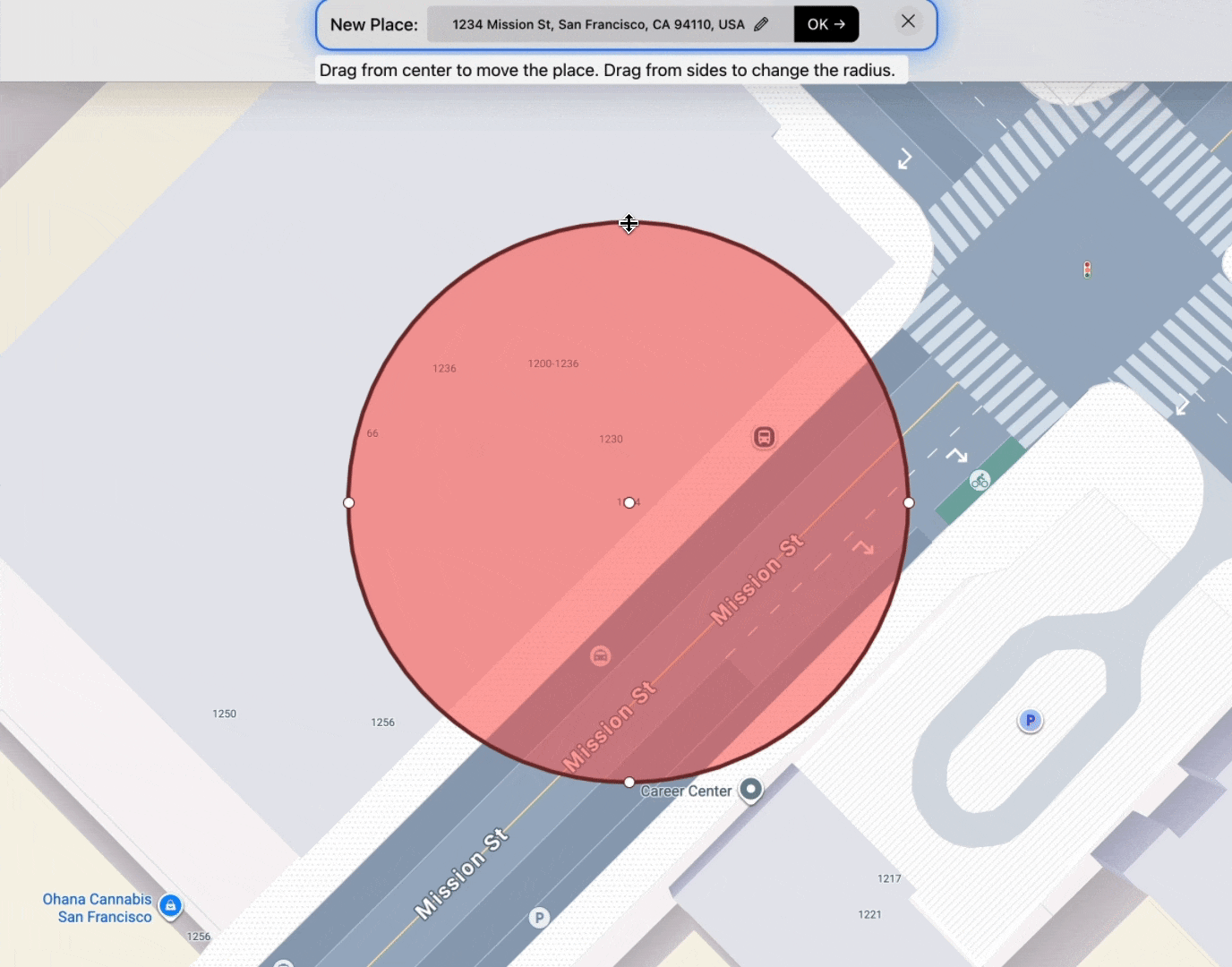 Step 4: Drag the center of the circle to move the Place or drag from the sides to change the radius (i.e. the size of the geofence). Then, click Ok to create.
