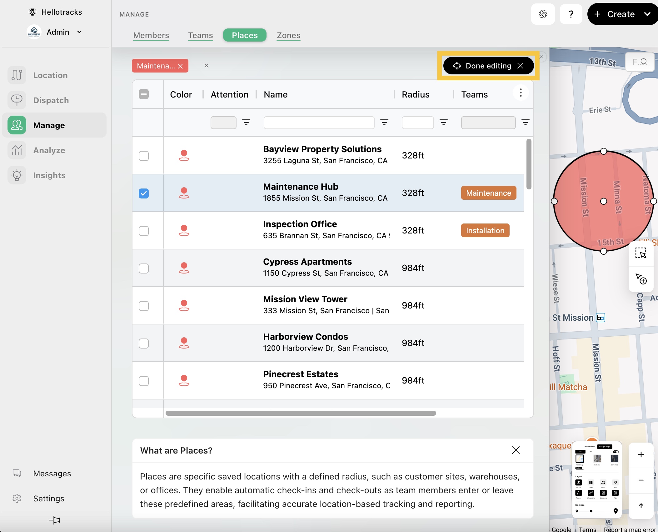 Step 5: Select one or more Places and click Edit region to reposition and adjust their radius on the map.