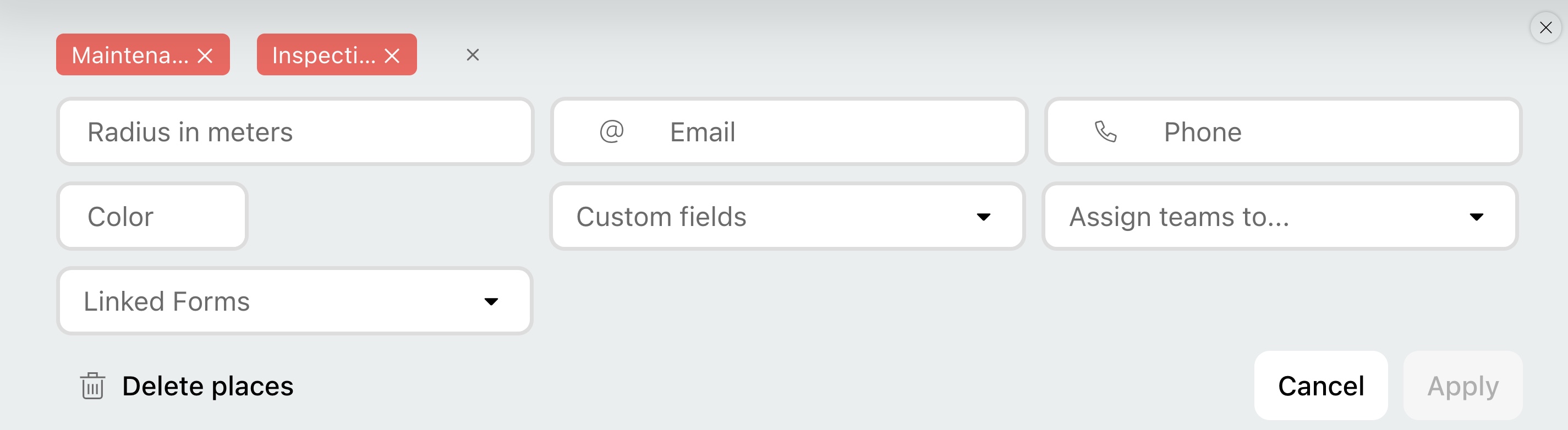 Step 4: Update the radius, color, contact details, custom fields, team assignments, or linked forms as needed, then click Apply.