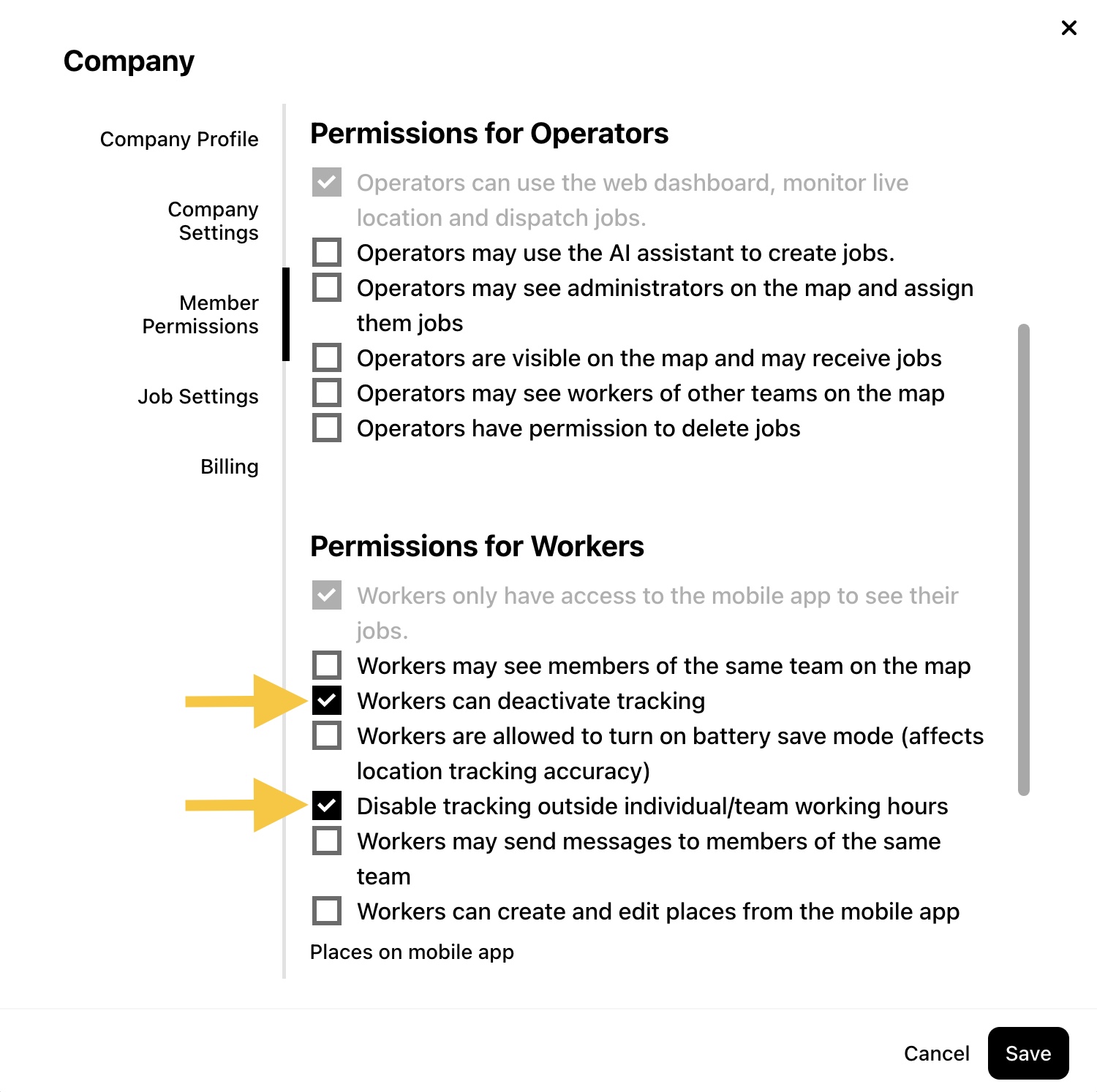 - If disabled: The tracking toggle is not available in the mobile app and Workers can’t manually turn tracking off.